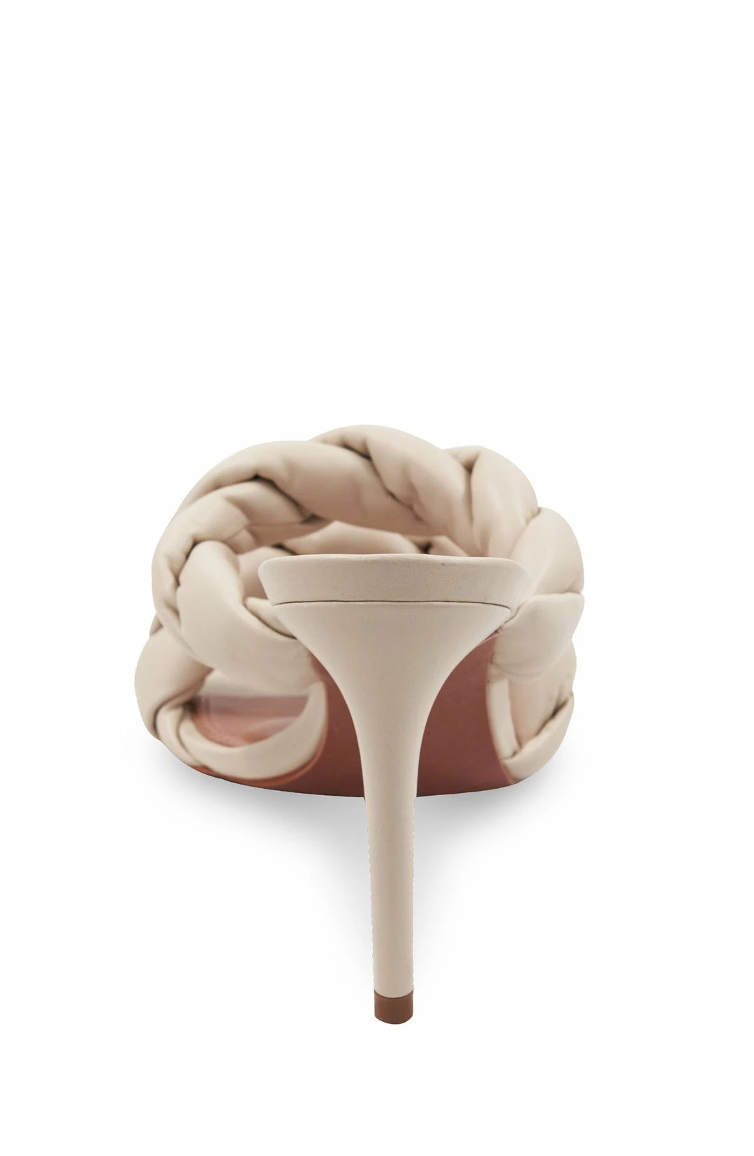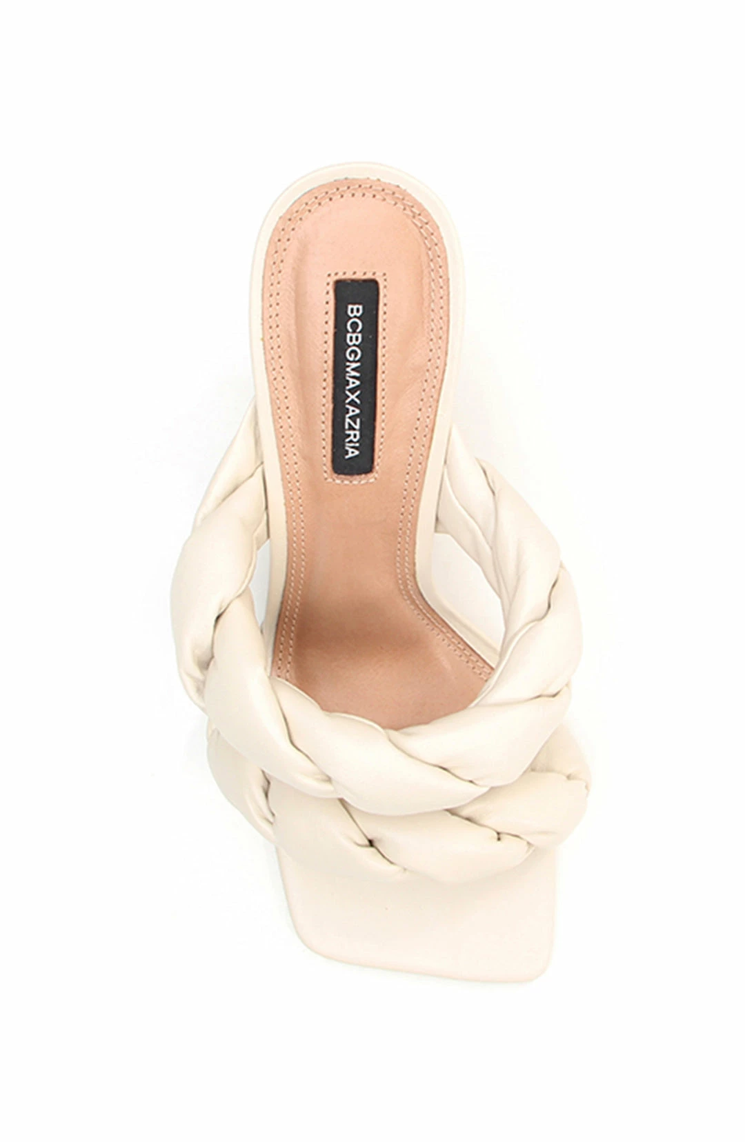 Striking slip-on sandal in a two-strap twisted leather design. Made with an open square toe and complete with a stiletto heel.