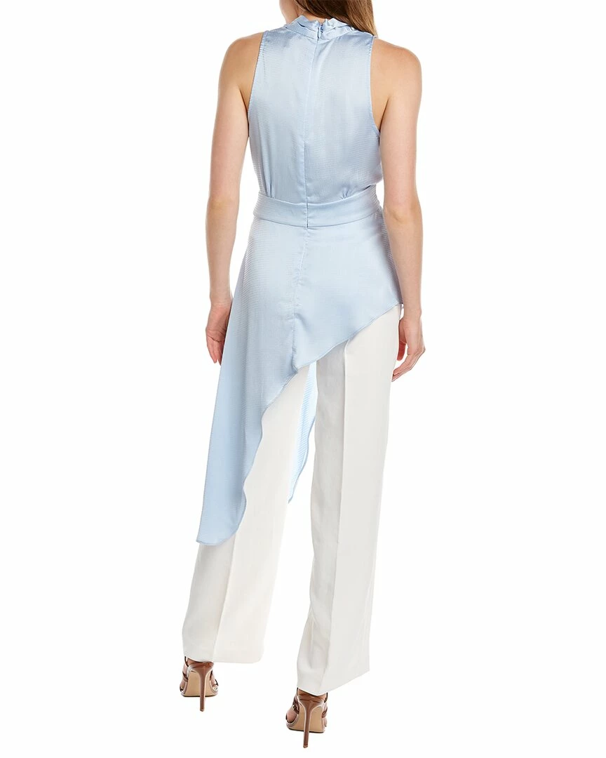 - Asymmetrical Top In Light Crystal Blue With Hammered Satin, Surplice Front, And Shirred Detailing