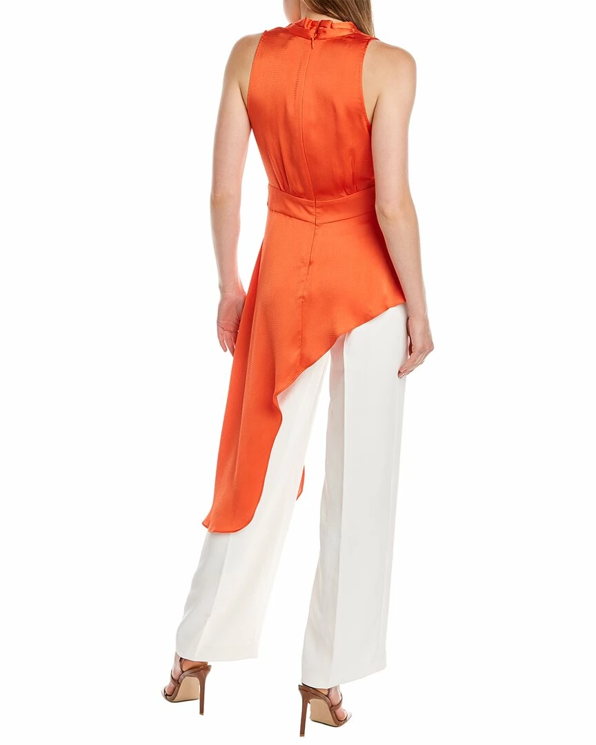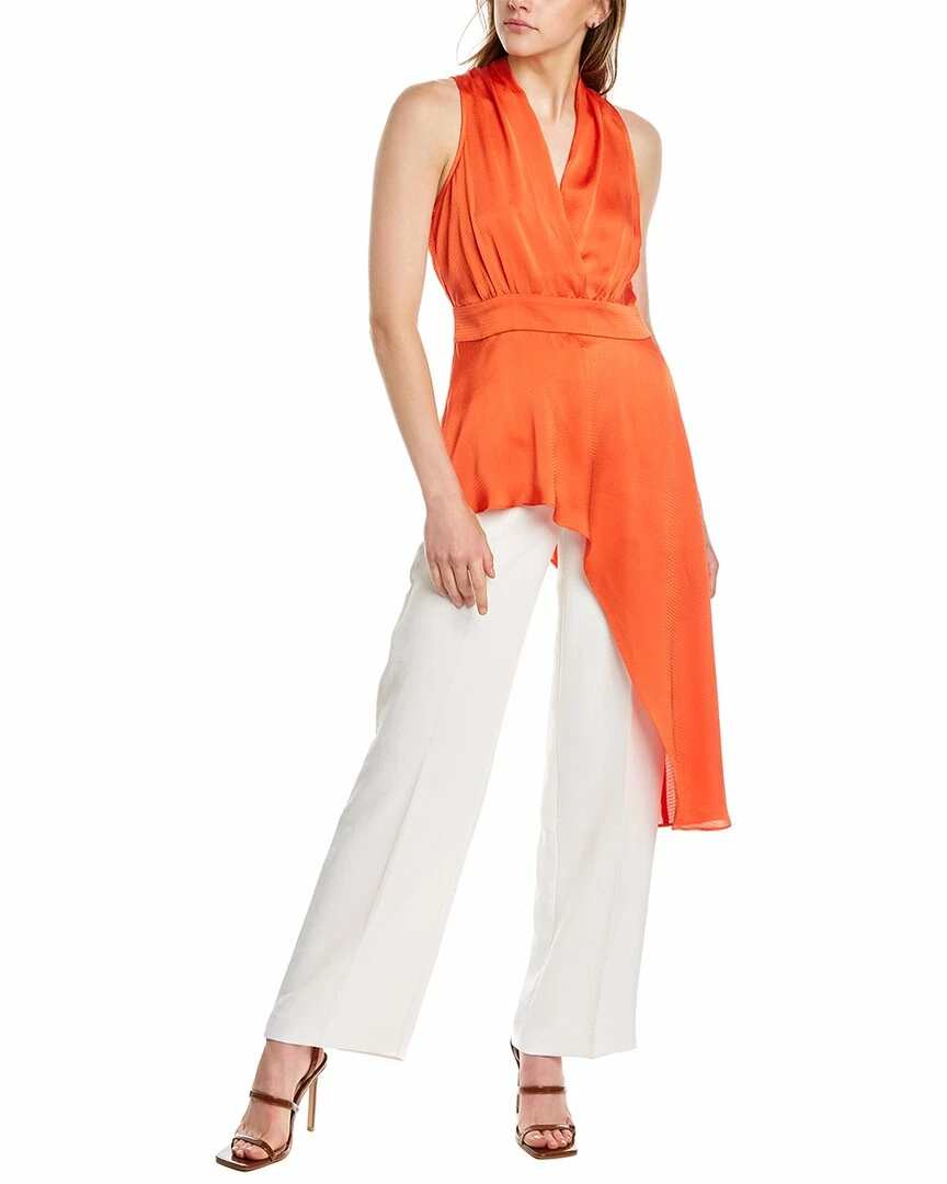 - Asymmetrical Top In Mandarin Red With Hammered Satin, Surplice Front, And Shirred Detailing