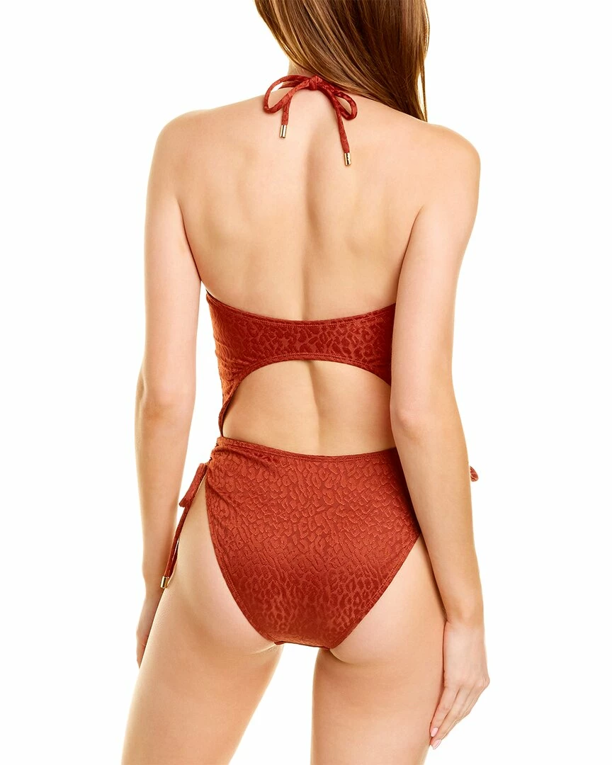 - Bandeau One-Piece In Paprika With Self-Tie Halter Neck, Removable Soft Cups, Cutout Design, Self-Tie Drawstring Accents And Gold-Tone Hardware