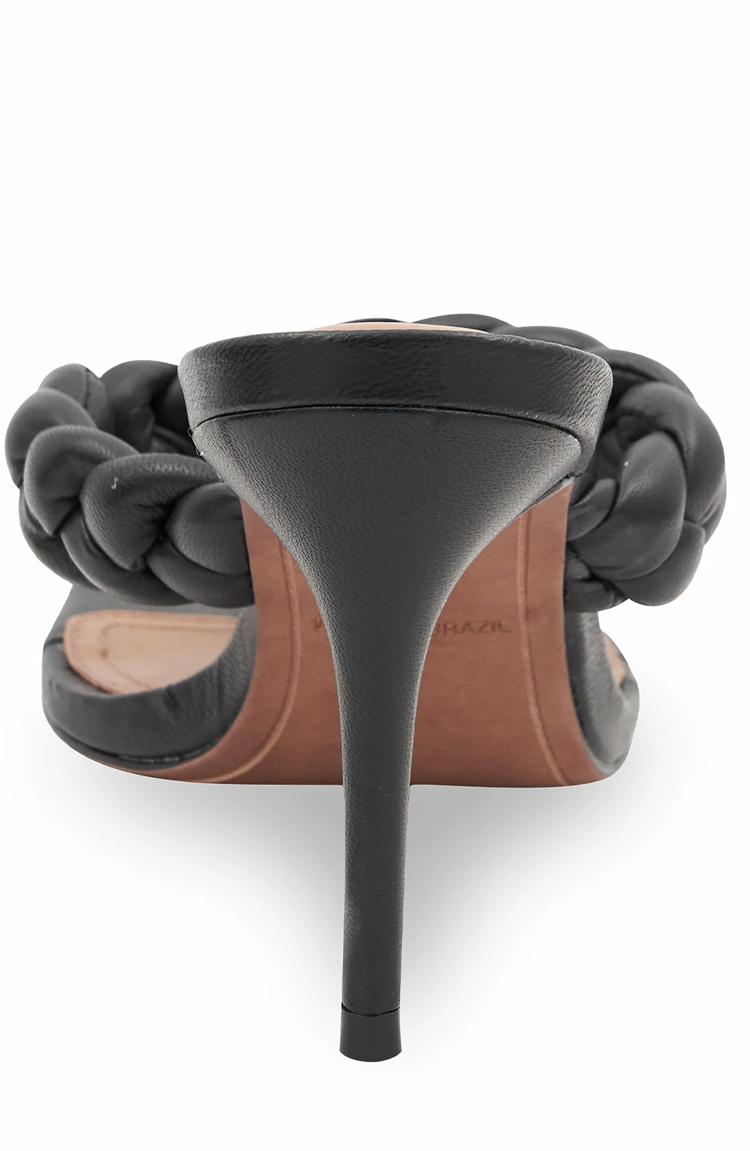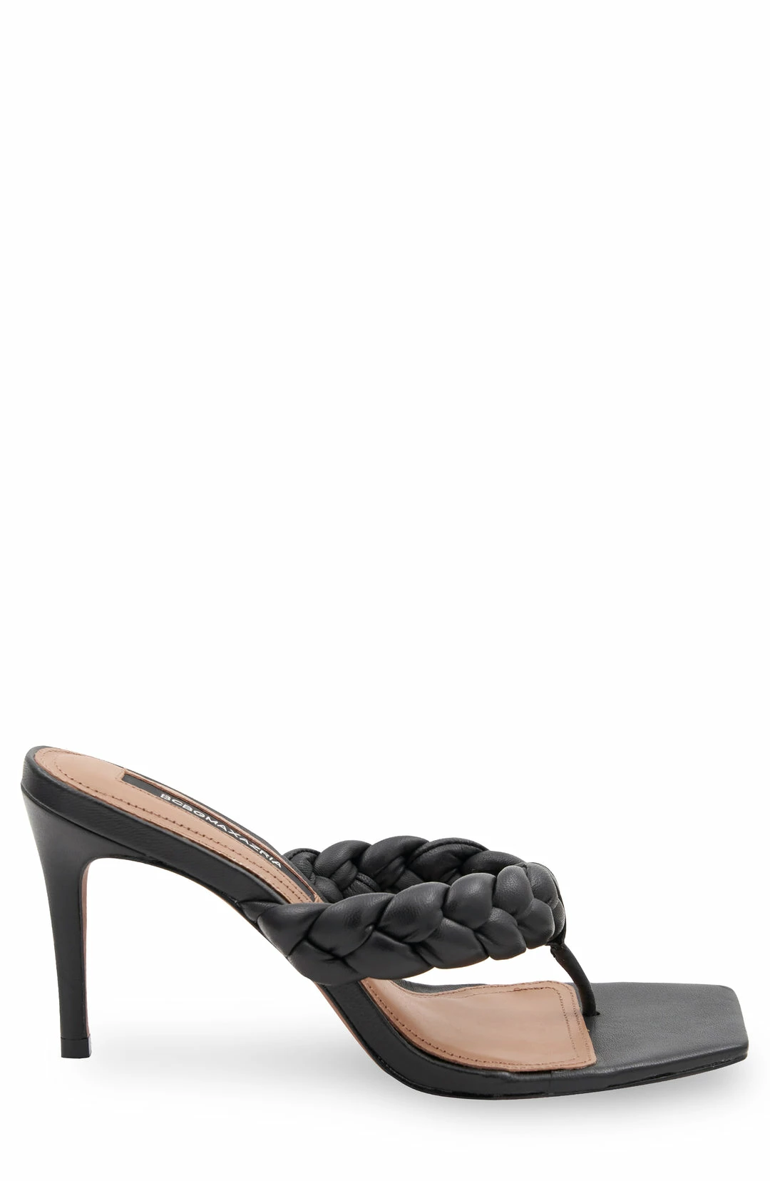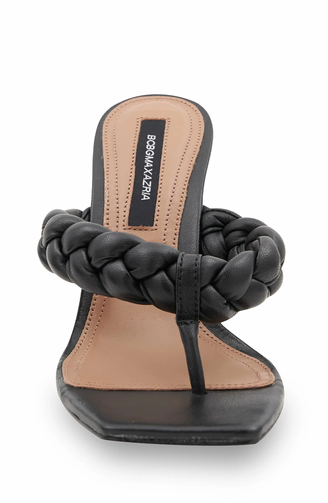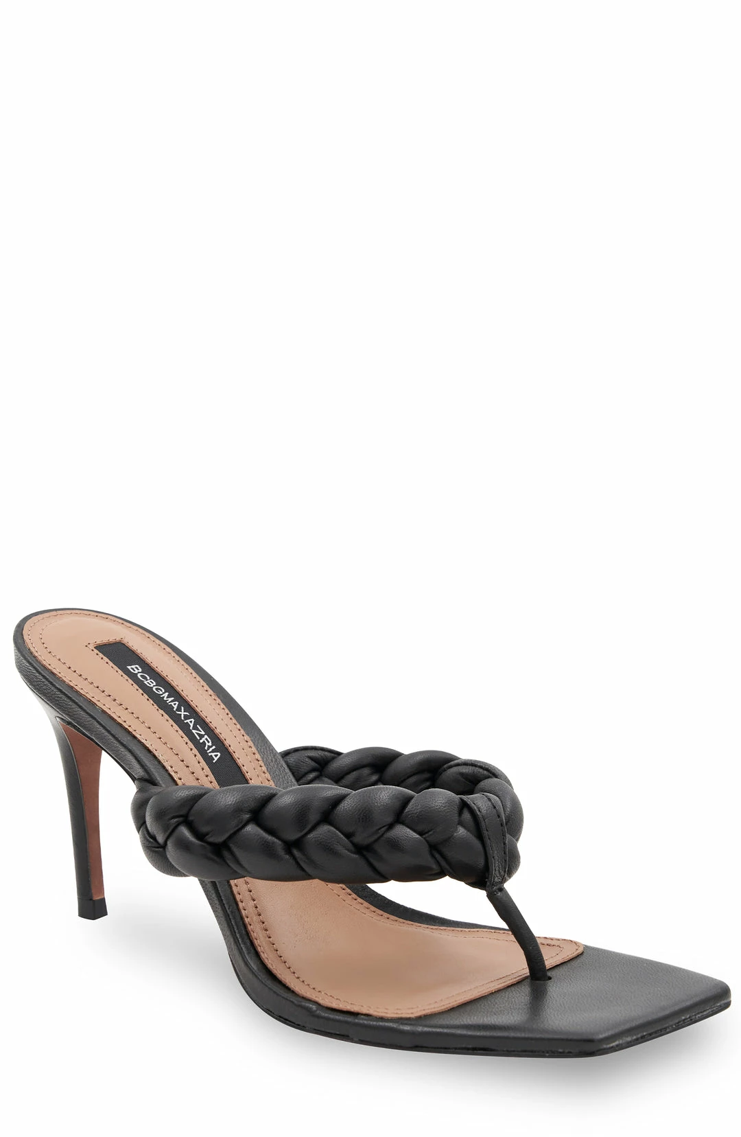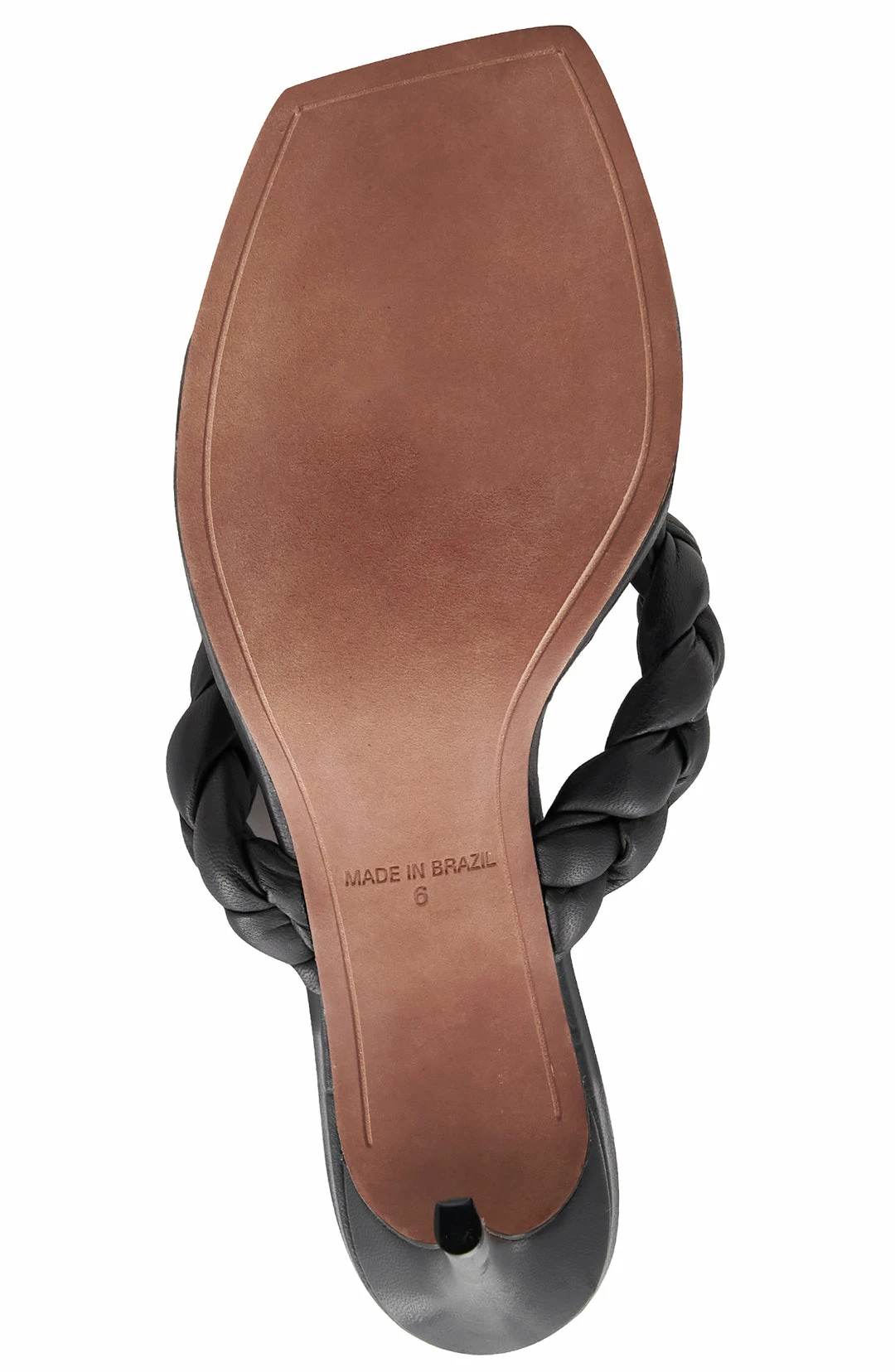 Chic mule sandal with a thong strap in a square toe silhouette. Crafted from leather in an elegant braided pattern. Finished with a sleek stiletto heel.