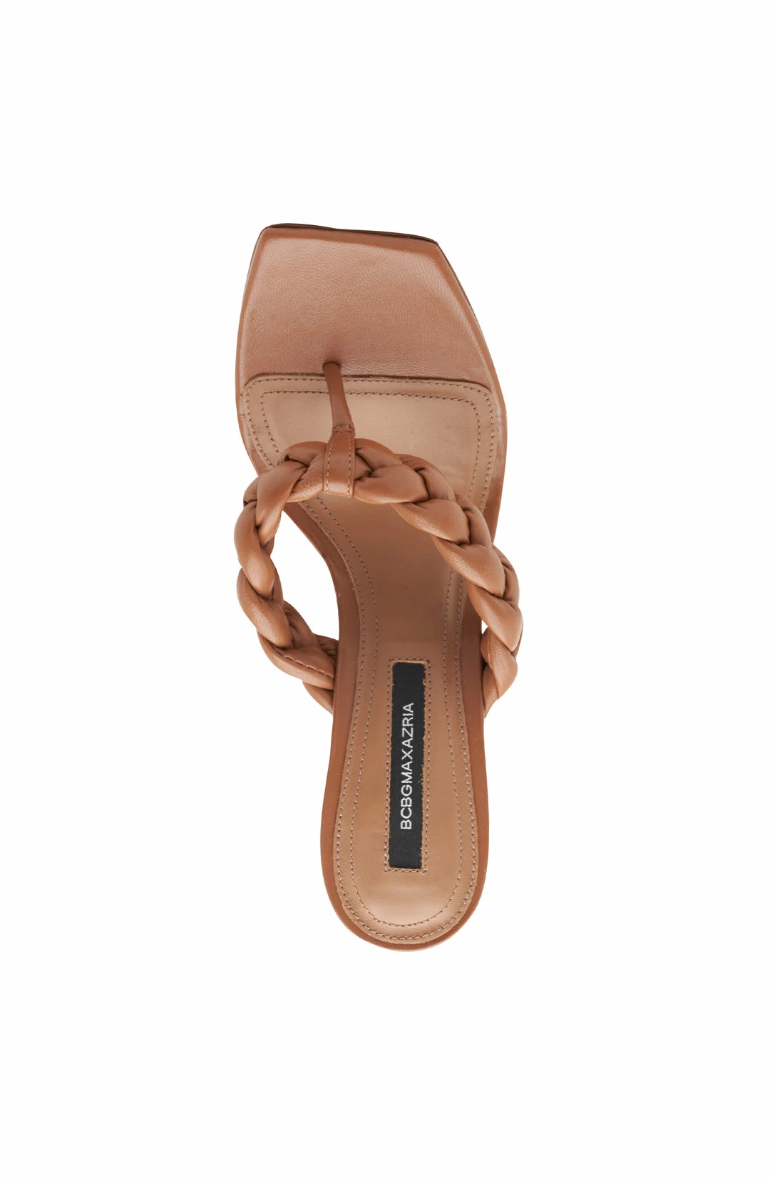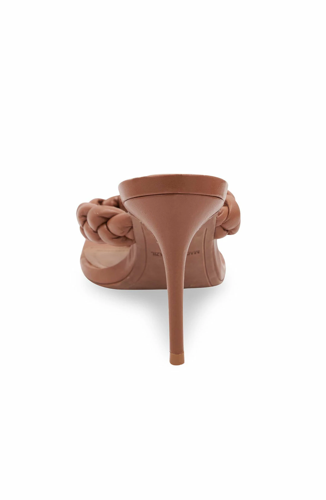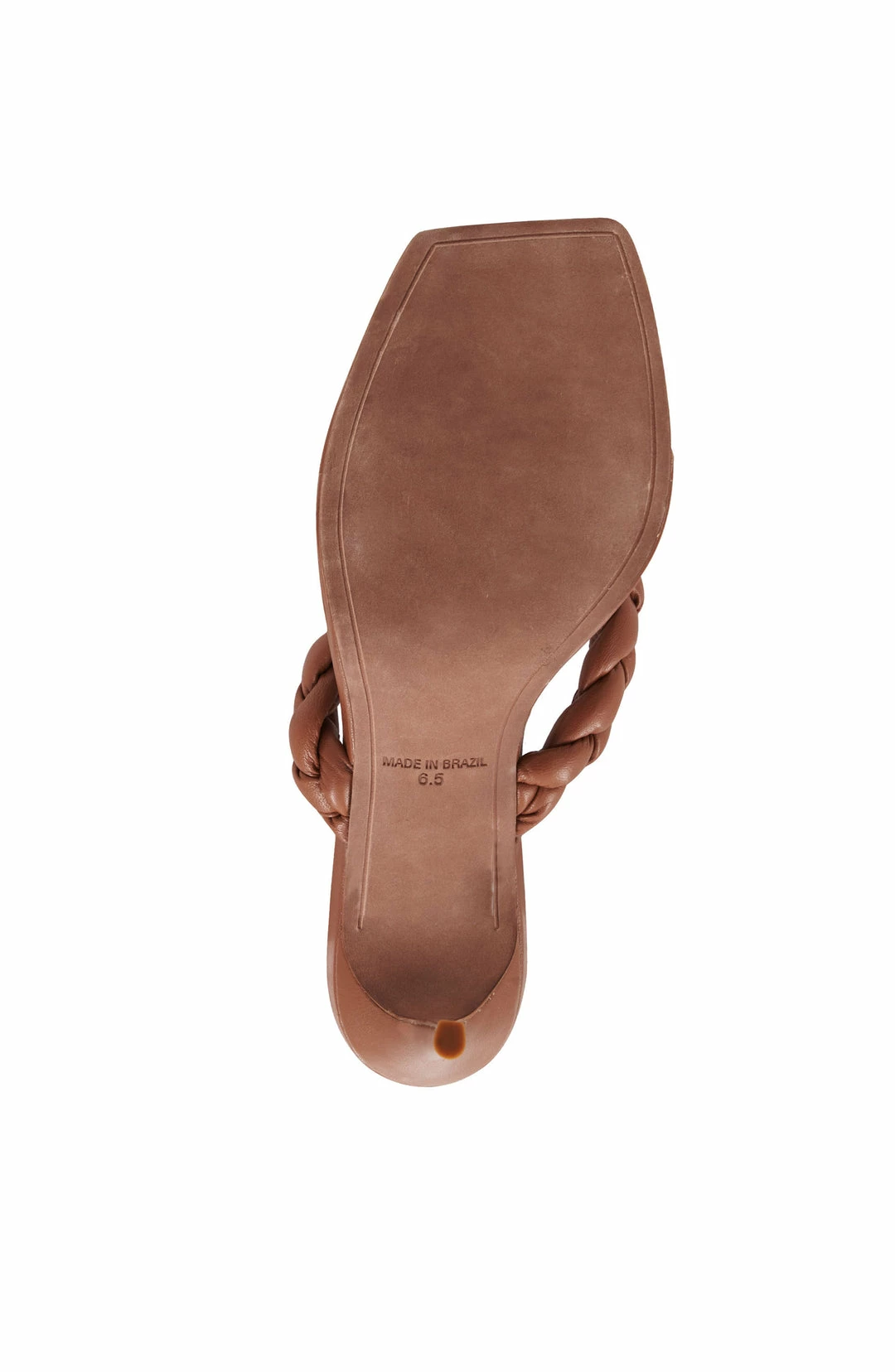 Chic mule sandal with a thong strap in a square toe silhouette. Crafted from leather in an elegant braided pattern. Finished with a sleek stiletto heel.