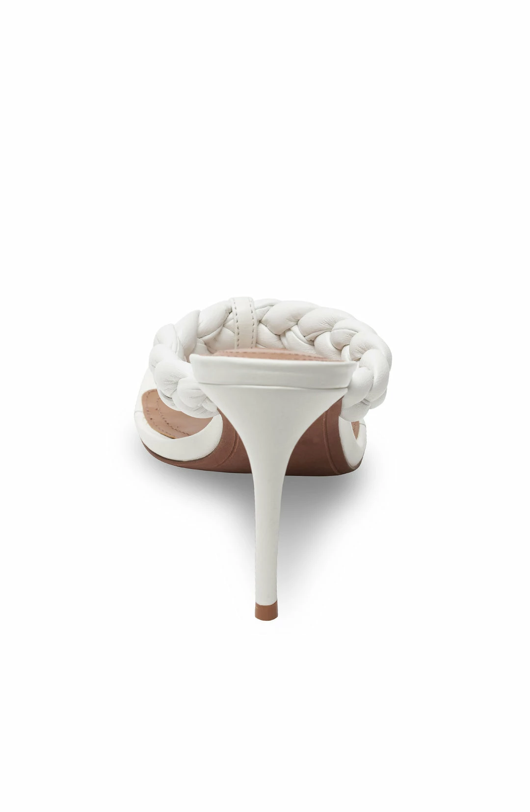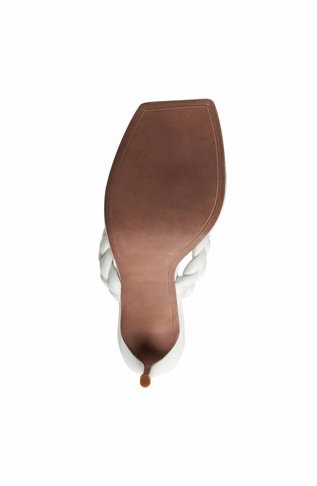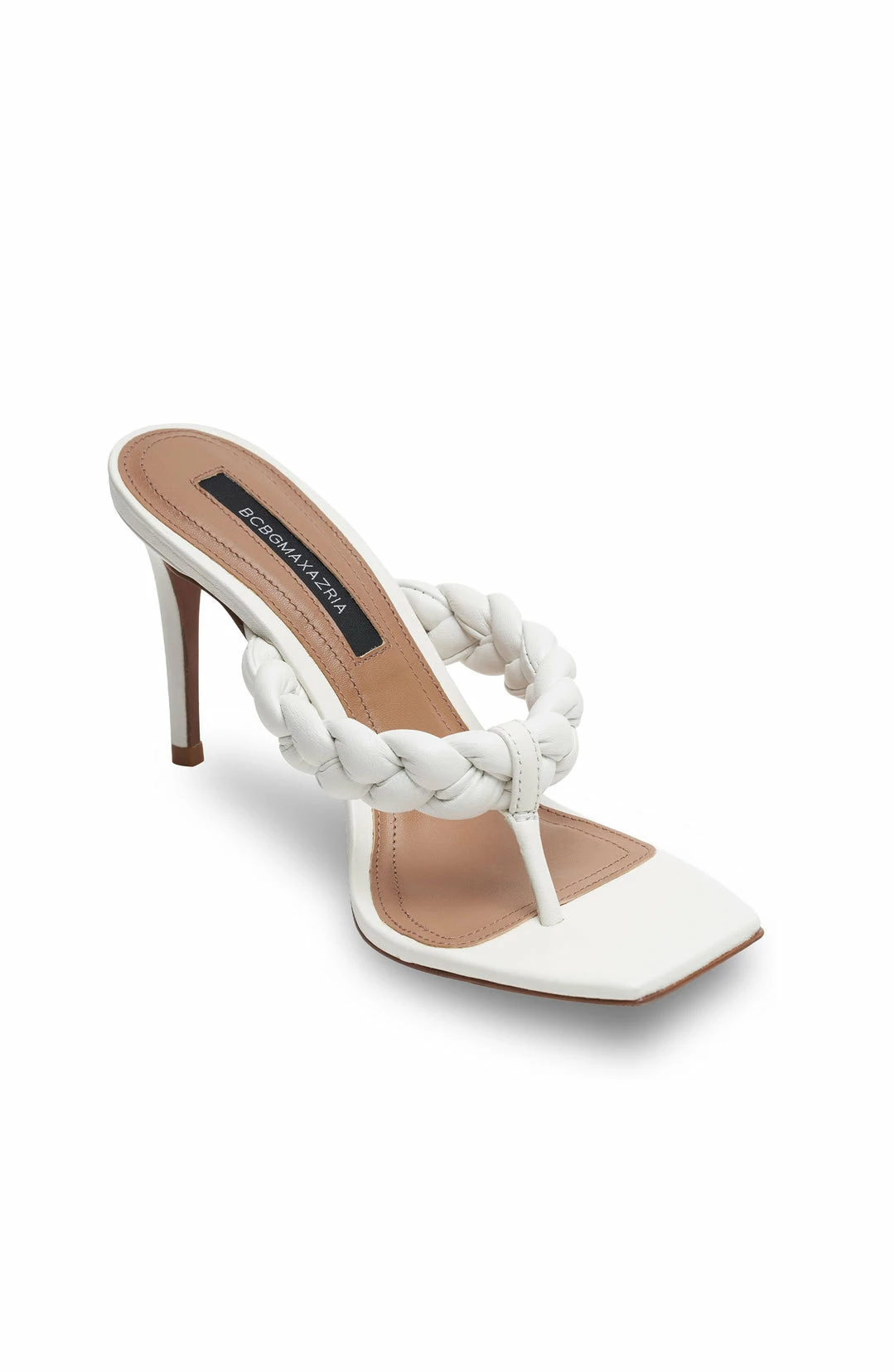 Chic mule sandal with a thong strap in a square toe silhouette. Crafted from leather in an elegant braided pattern. Finished with a sleek stiletto heel.