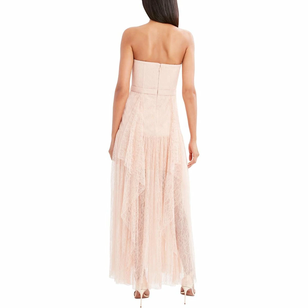 Feel effortlessly romantic in this strapless lace evening dress by BCBG Max Azria. Made with100% Nylon. Delicate lace offers an ethereal look to a classic style. It features an A-Line construction, a strapless bust and zipper closure.
