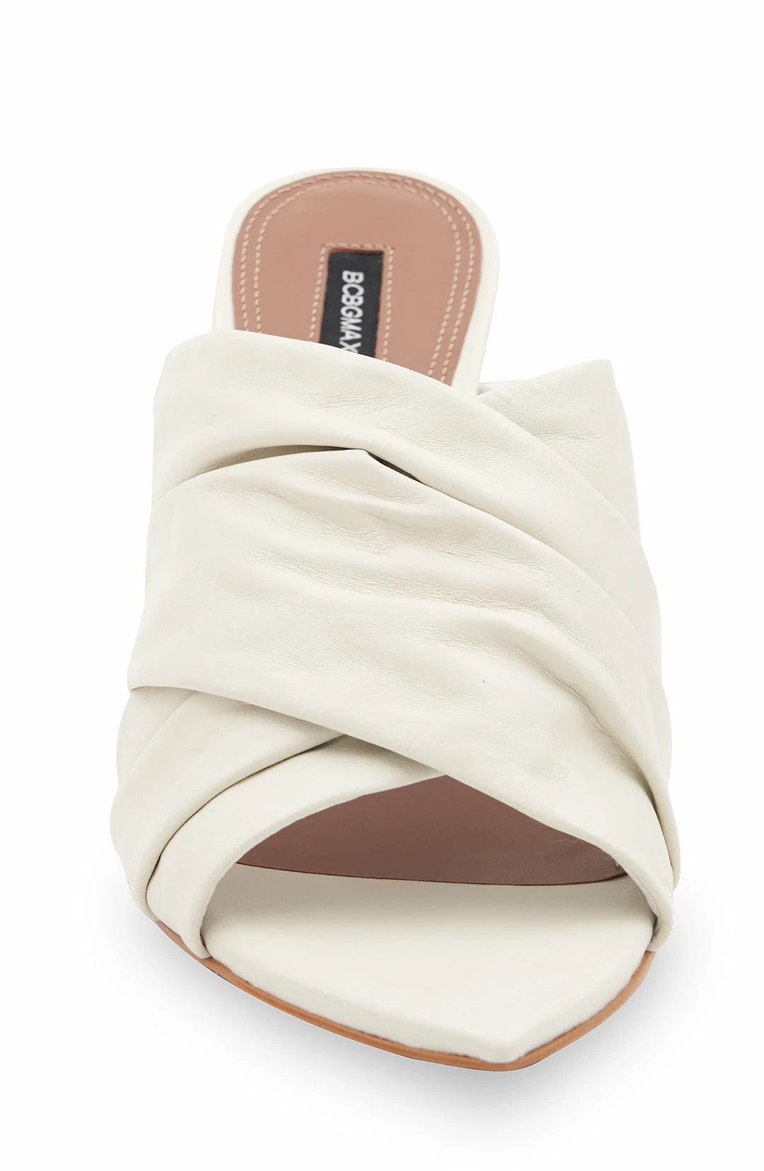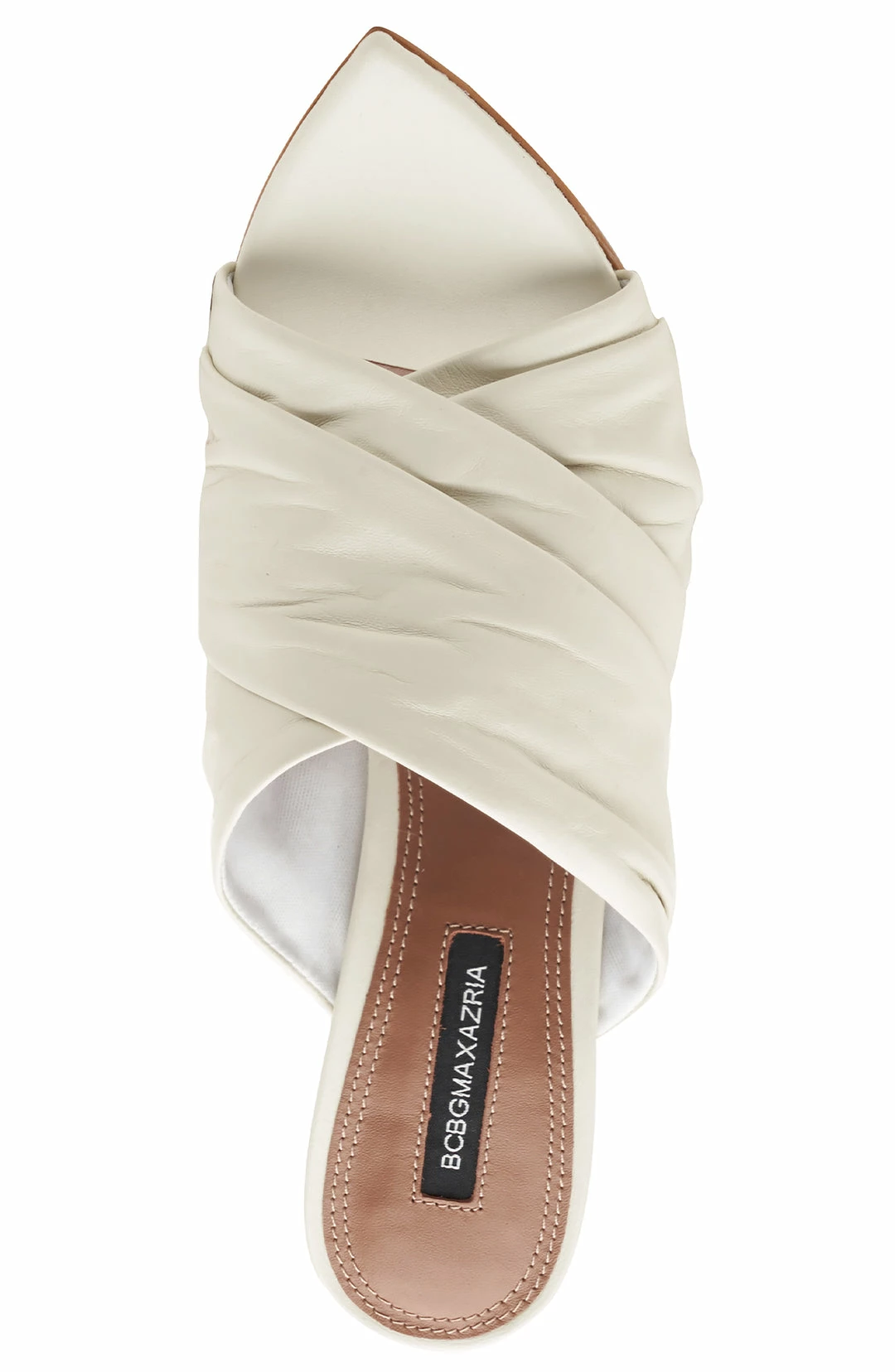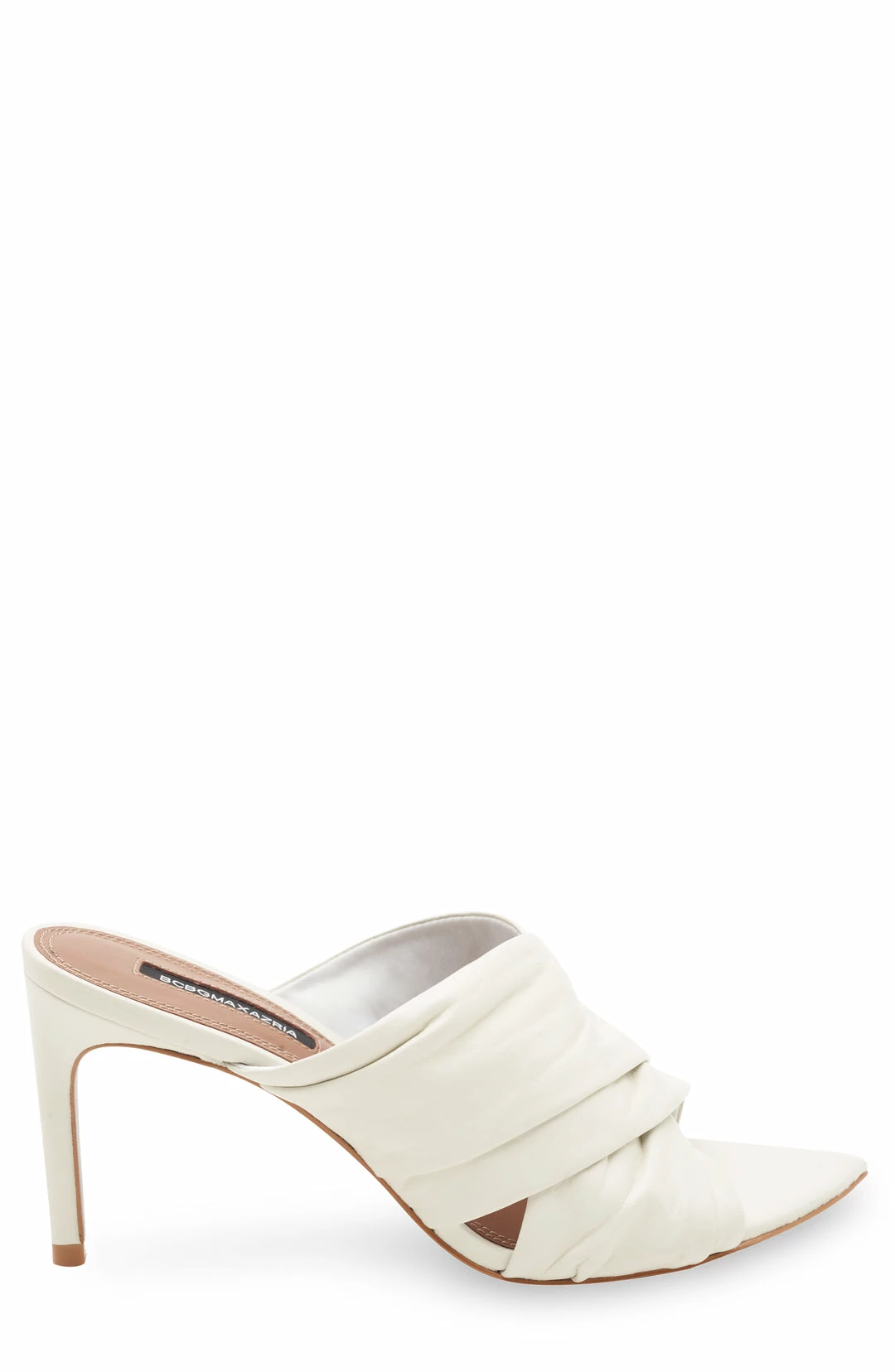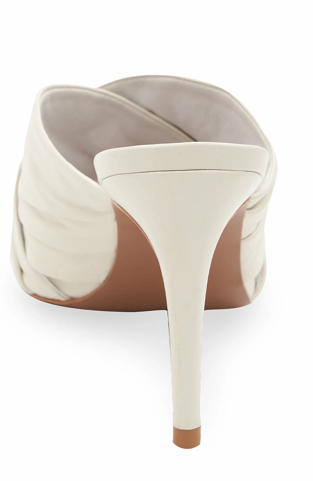 Bold mule dress sandal with a modern pointed peep toe. Crafted from ruched leather in a crossover design. Finished with a sleek stiletto heel.
