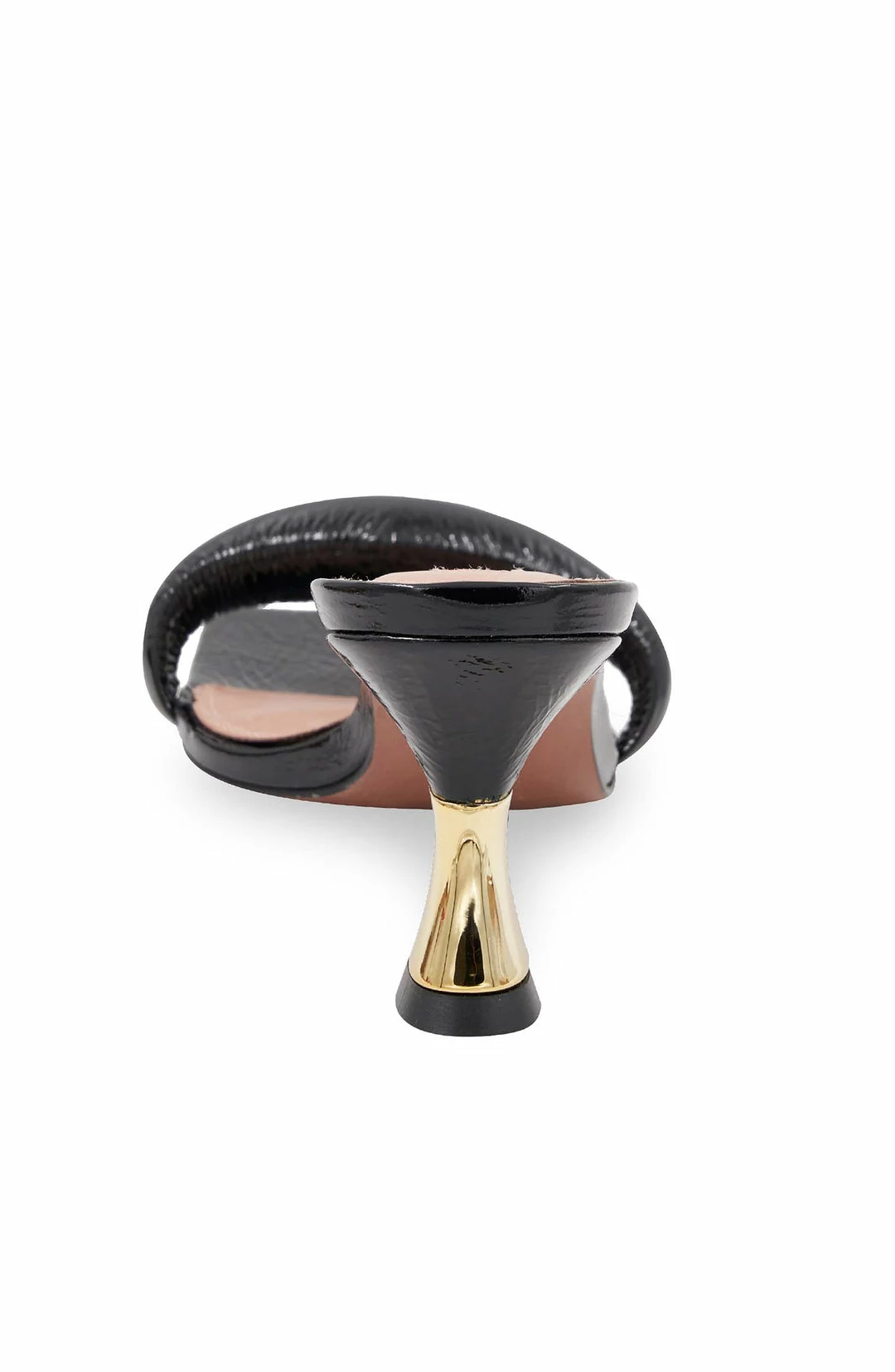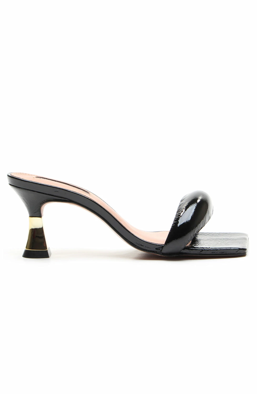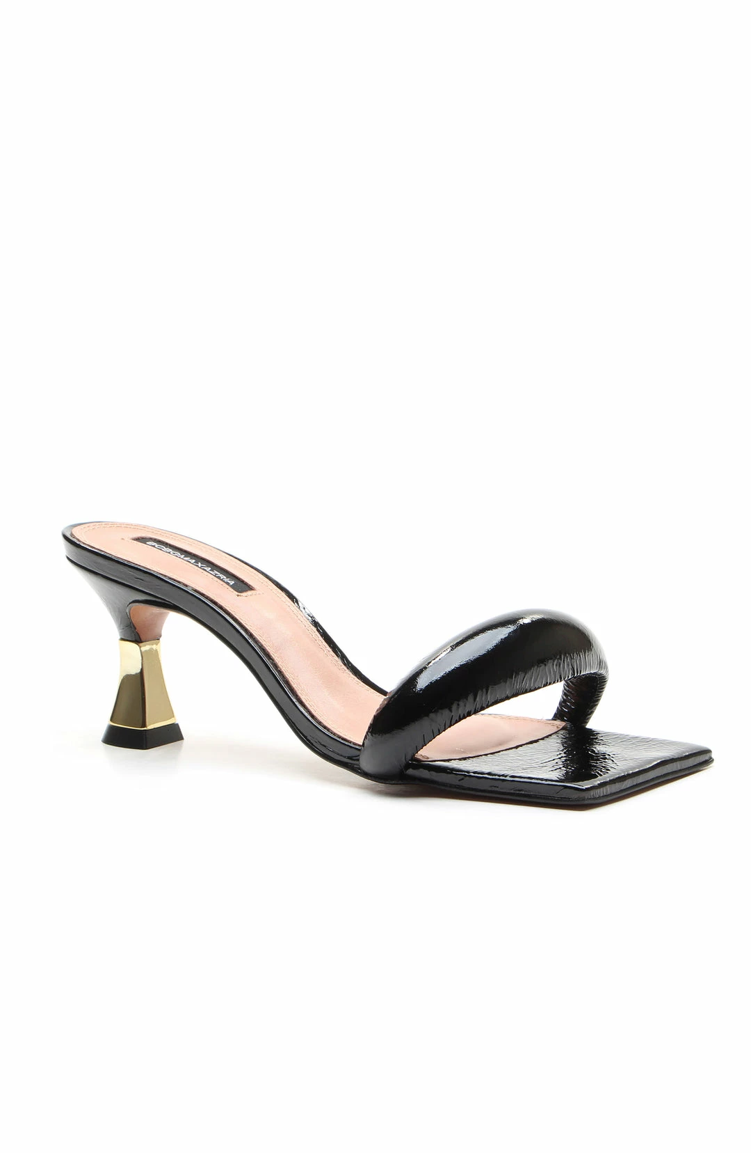 Wear-everywhere slide sandal with a modern square toe for an eye-catching silhouette. Crafted with leather and finished with a metallic midi heel.