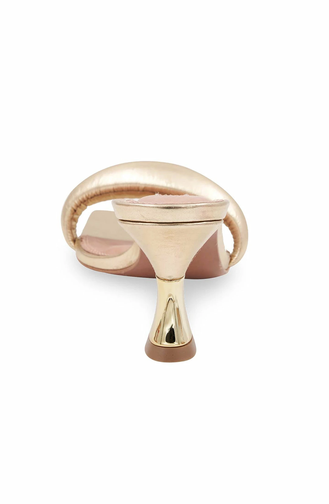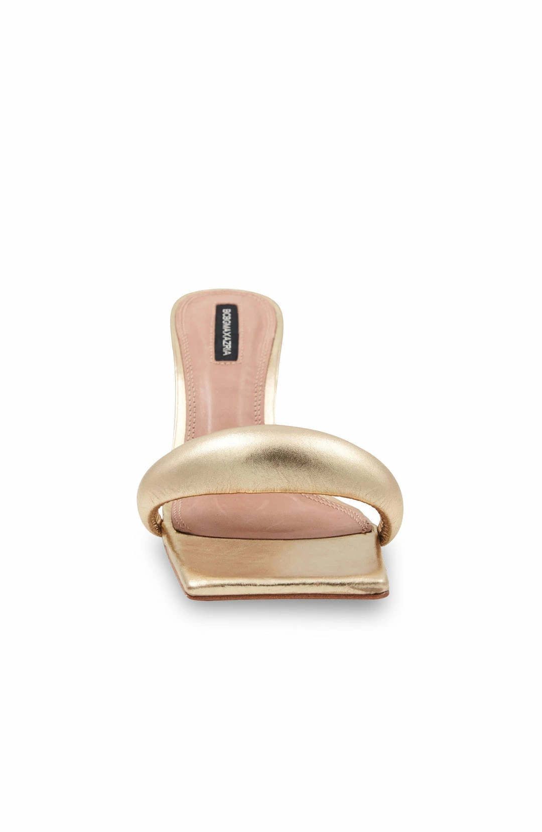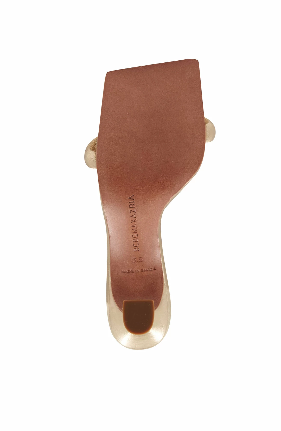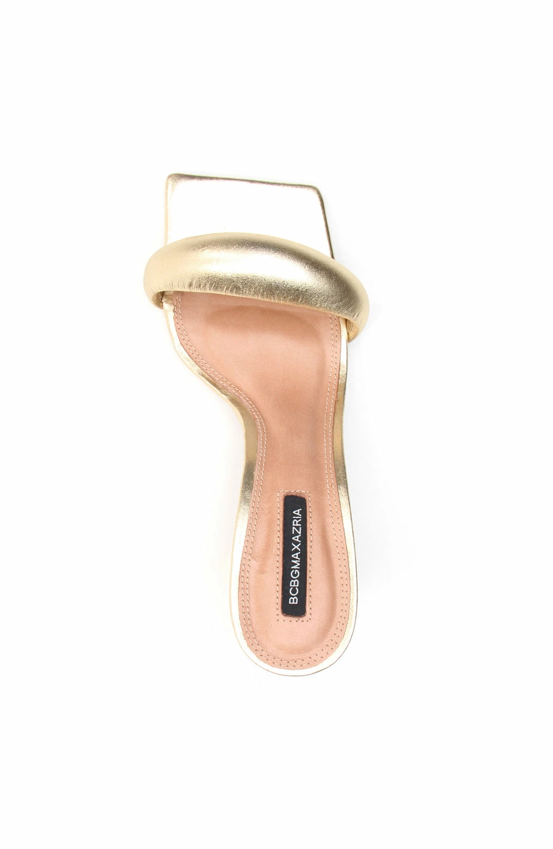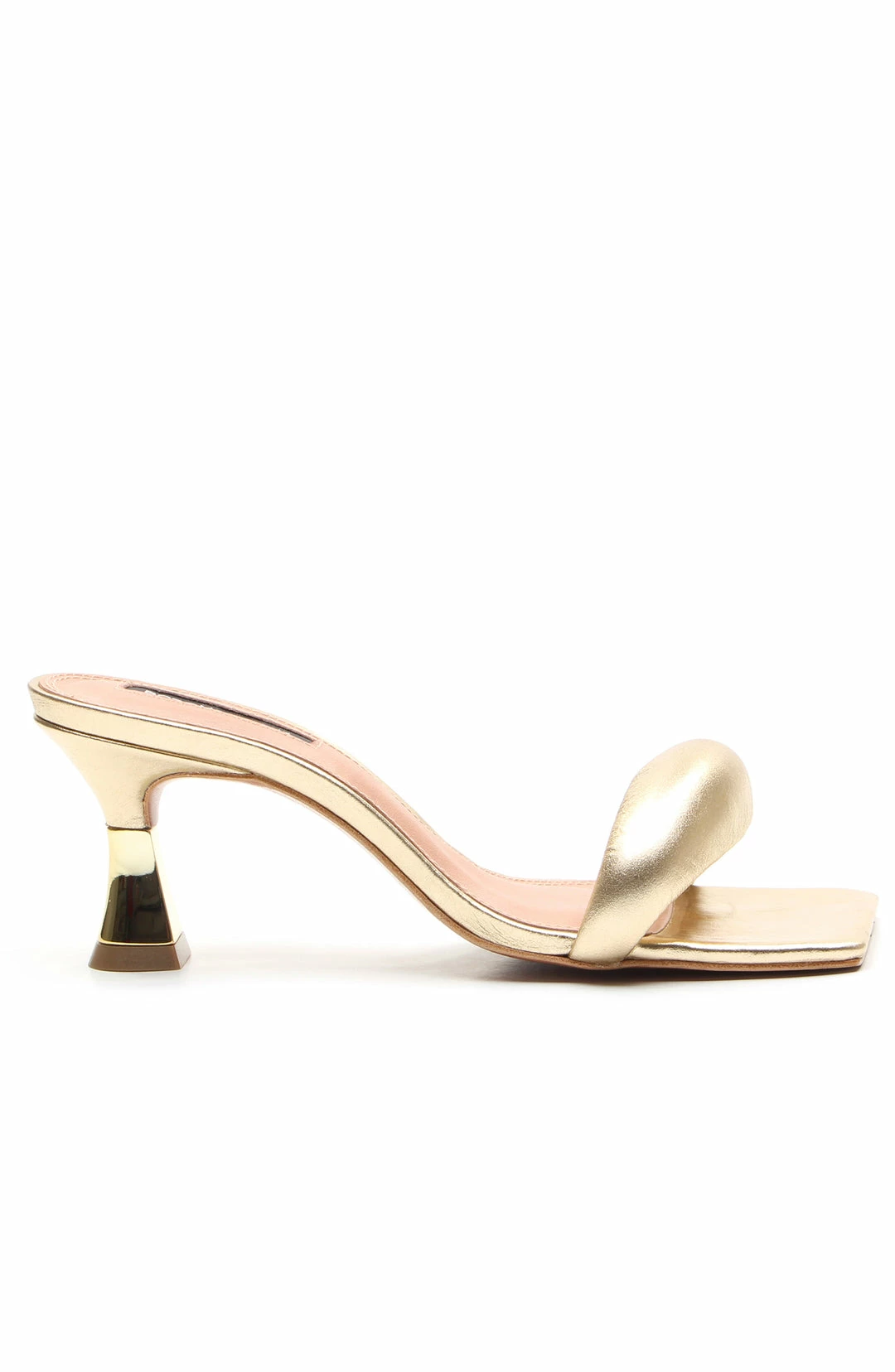 Wear-everywhere slide sandal with a modern square toe for an eye-catching silhouette. Crafted with leather and finished with a metallic midi heel.