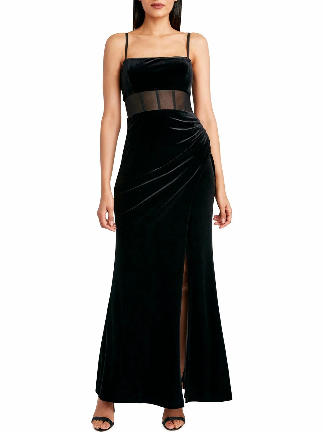 Radiate elegance in the Kai sleeveless evening dress by BCBG Max Azria. Made with 90% Polyester and 10% Spandex. The soft sultry velvet is adorned with a bustier style cut and ruched details. This dress is perfect for special events and occasions and features a back zipper.