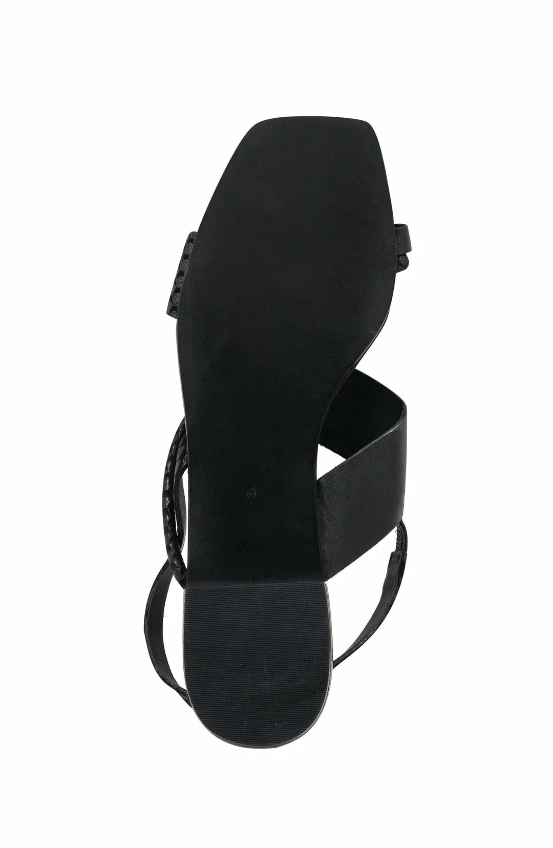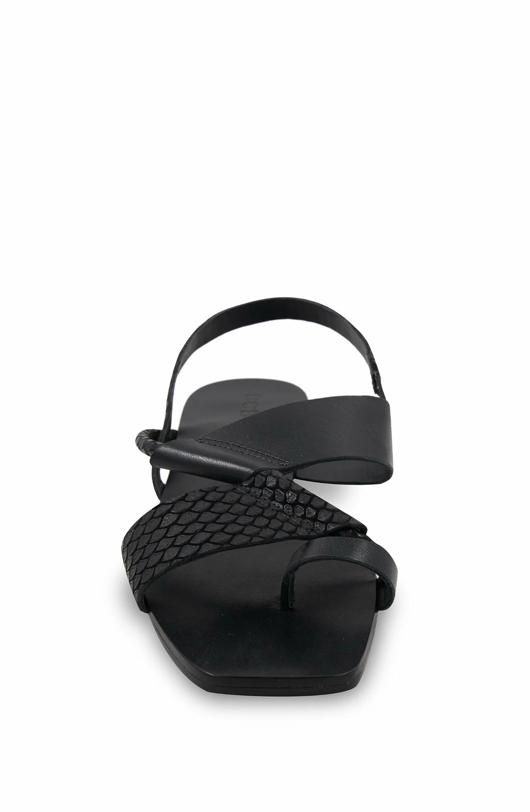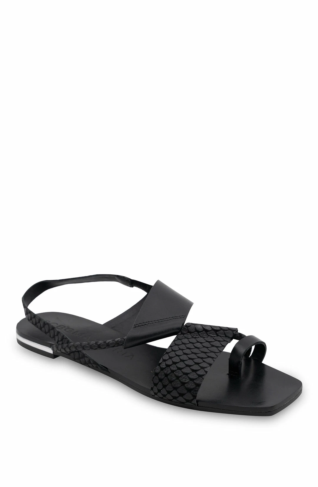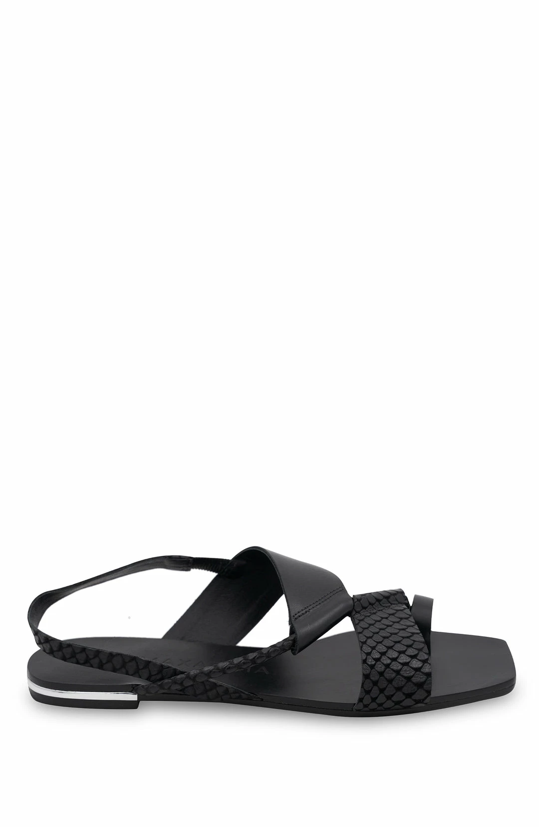 Elevated mixed leather flat sandal in an open square toe silhouette. Crafted from a combination of smooth and embossed leather. Designed with a toe loop, a wide toe strap and a stretch slingback heel strap for a secure fit. Perfect for weekends and vacations.