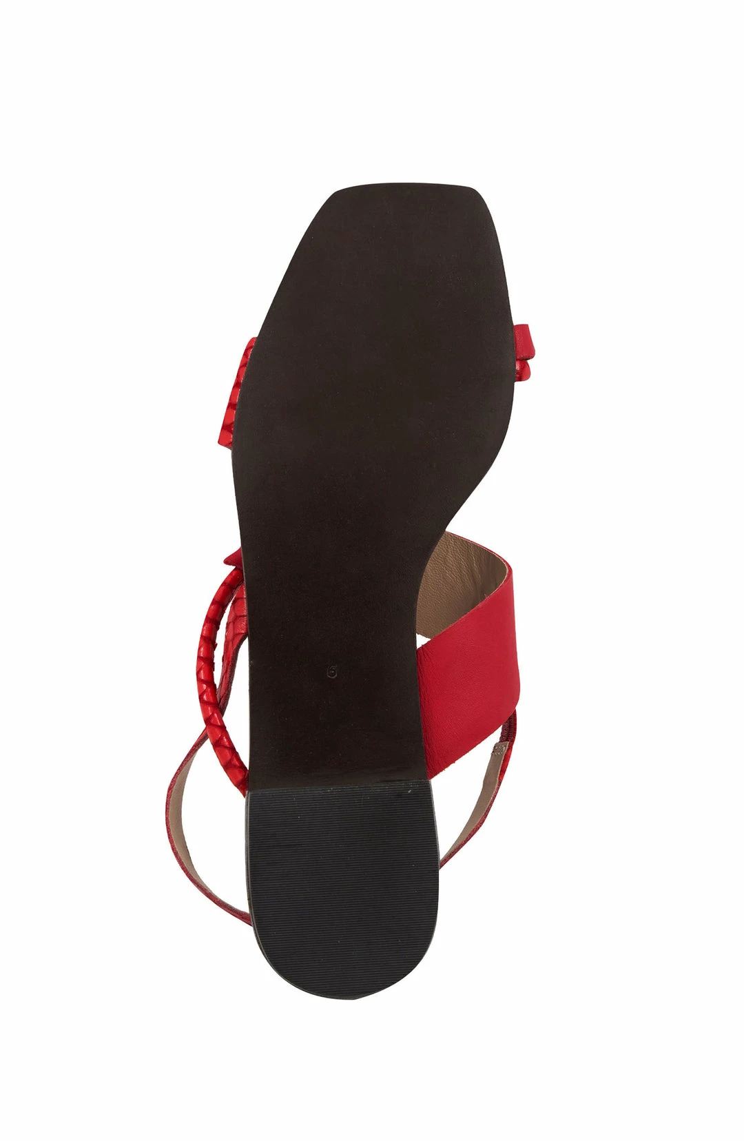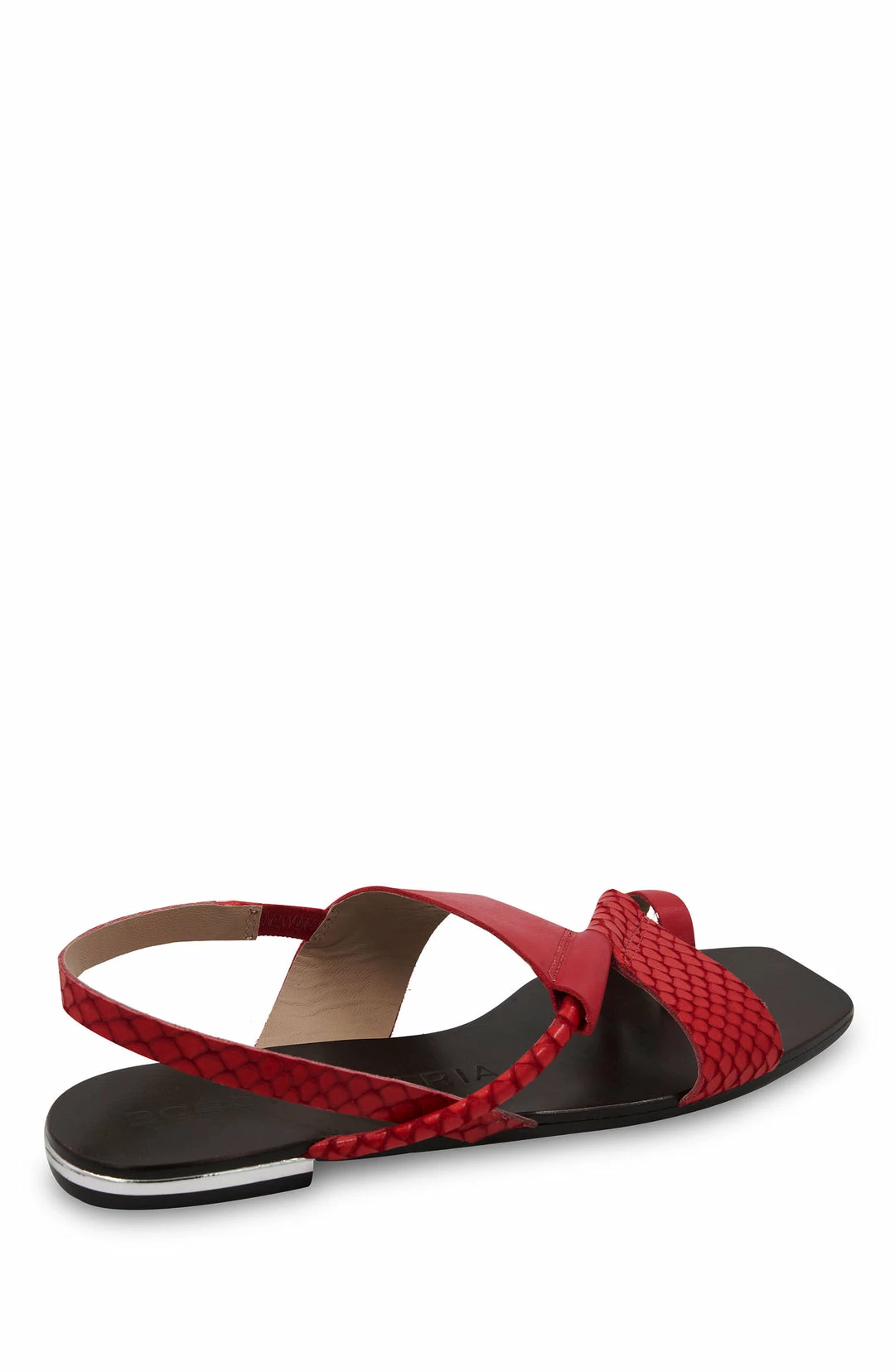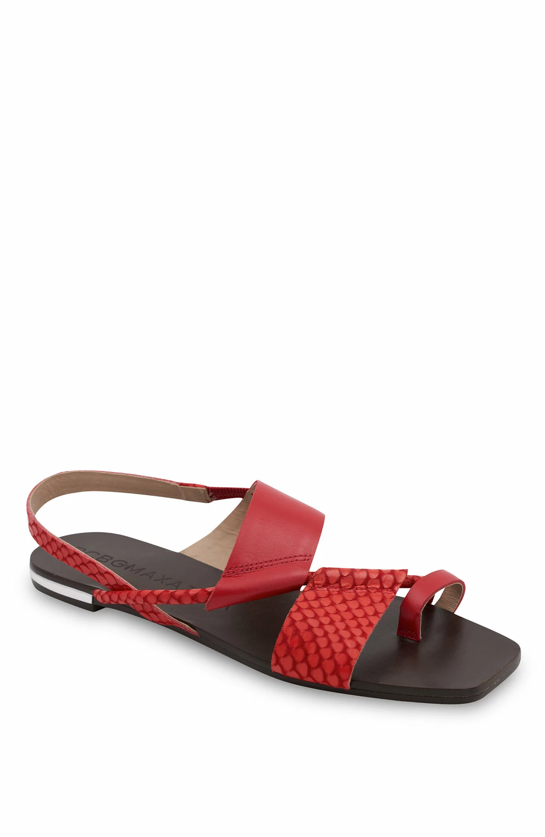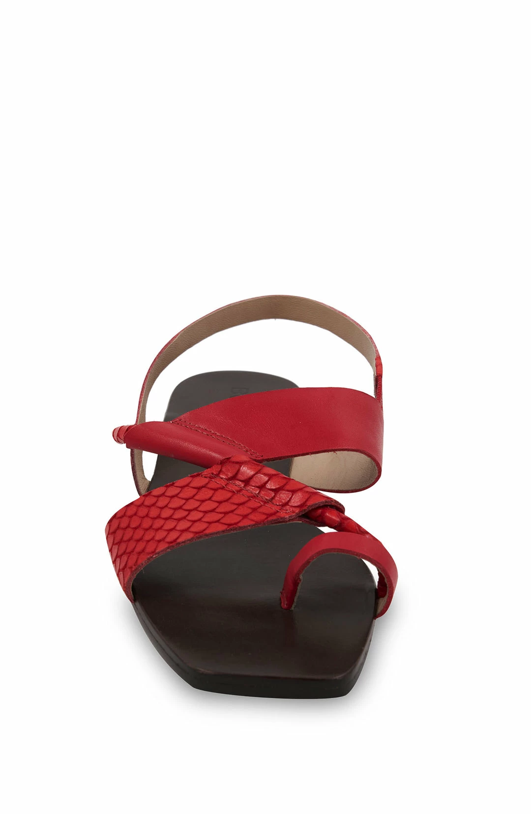 Elevated mixed leather flat sandal in an open square toe silhouette. Crafted from a combination of smooth and embossed leather. Designed with a toe loop, a wide toe strap and a stretch slingback heel strap for a secure fit. Perfect for weekends and vacations.