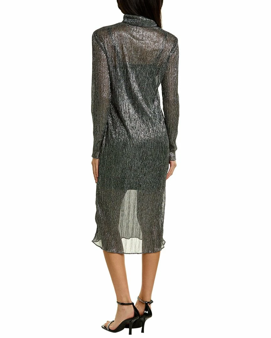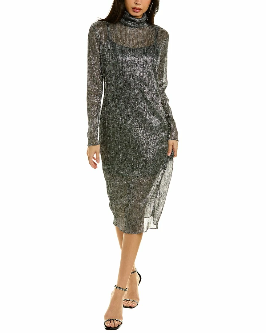 - Metallic Midi Dress In Gunmetal With Pleated Metallic Fabric, Turtleneck And Slip Dress Lining