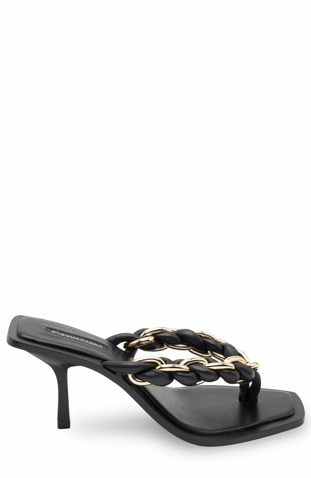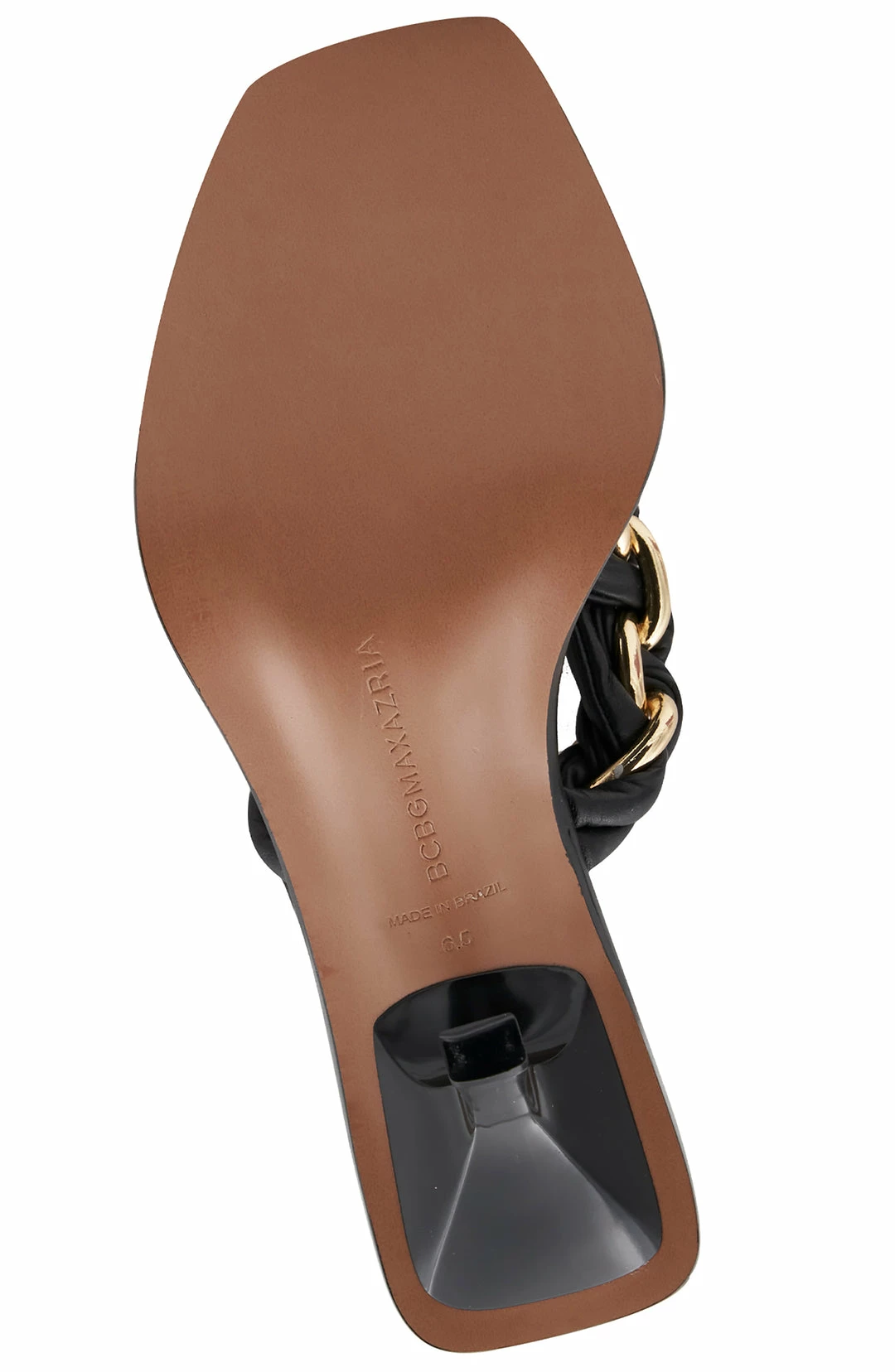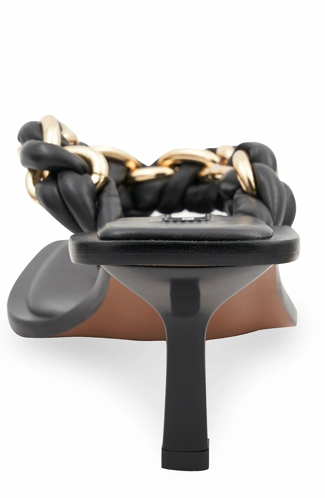 Heeled sandals featuring leather upper with chunky braids weave detailing through polished chain links.