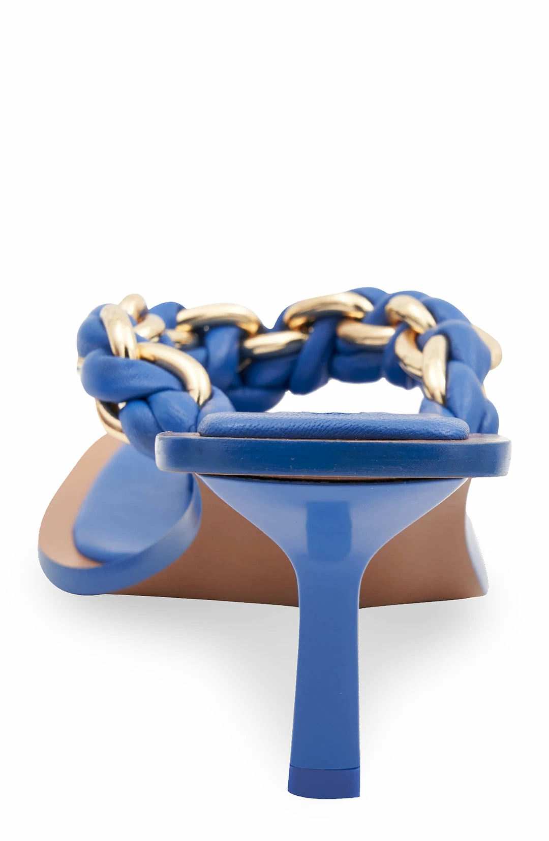 Heeled sandals featuring leather upper with chunky braids weave detailing through polished chain links.