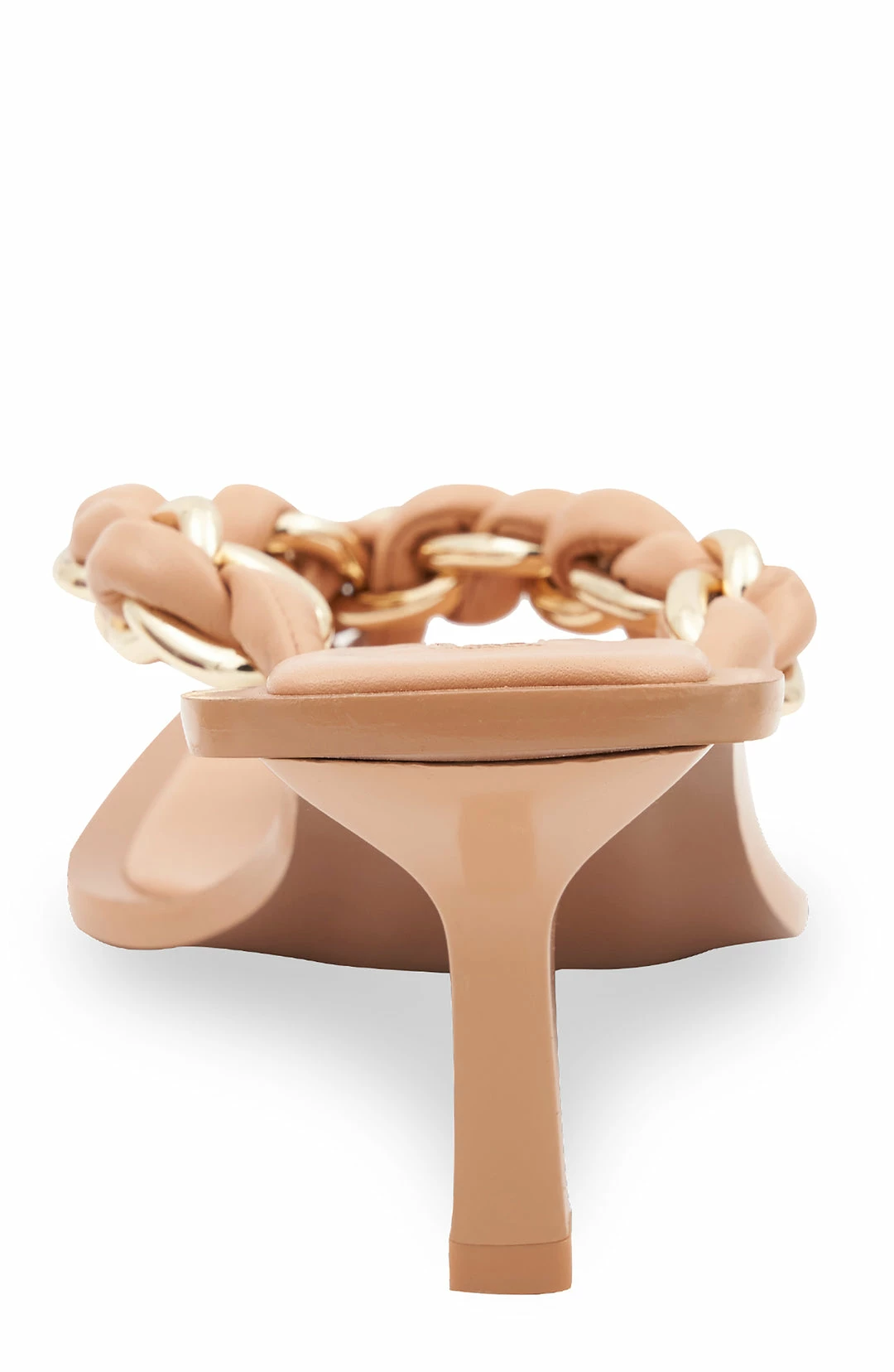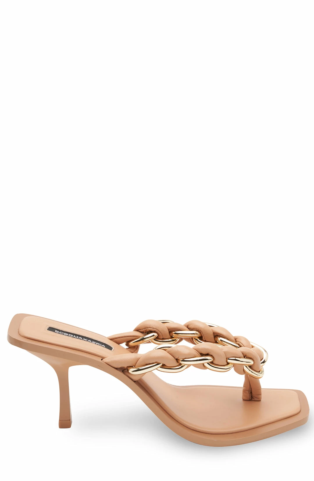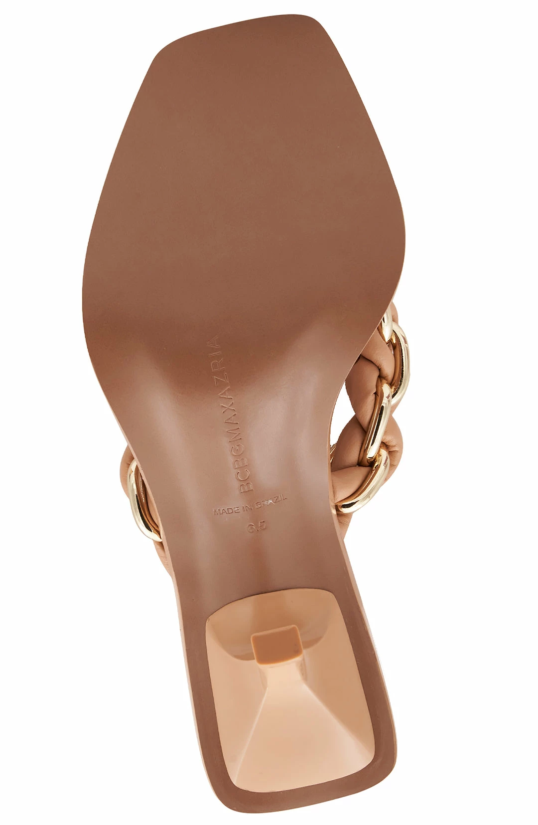 Heeled sandals featuring leather upper with chunky braids weave detailing through polished chain links.