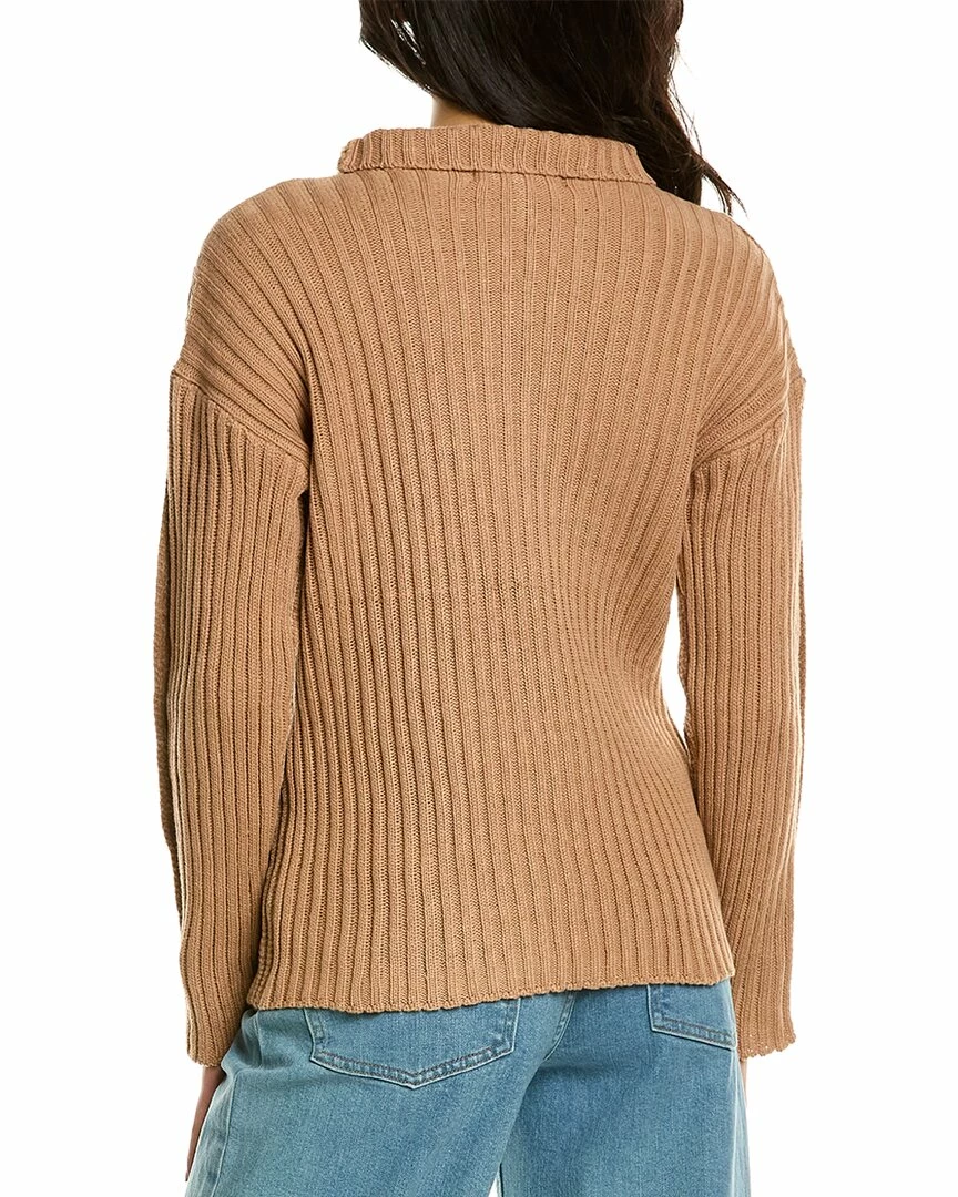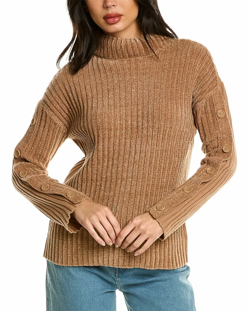 - Mock Neck Sweater In Camel With Rib Design, Chenille Back, Dropped-Shoulder Sleeves, And Button Accents At Sleeve