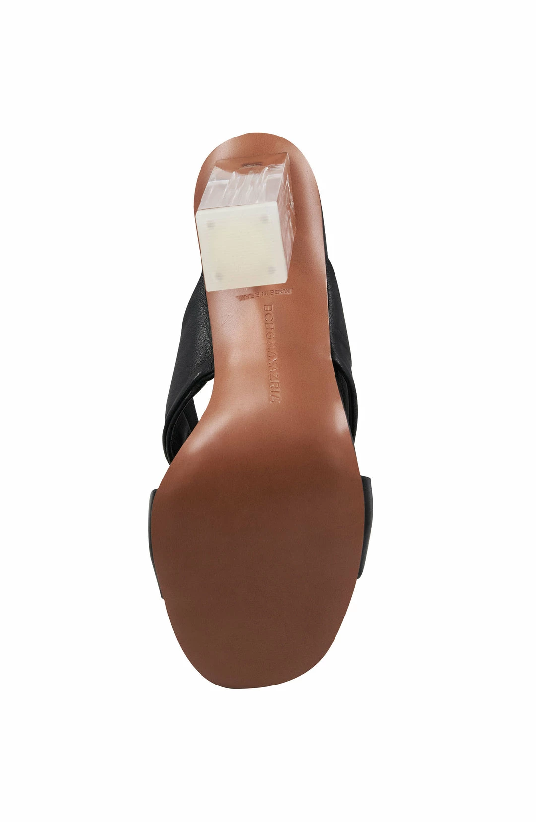 Leather slip-on sandal with a hint of edge. Crafted with wide knotted straps. Finished with a bold Lucite block sandal.
