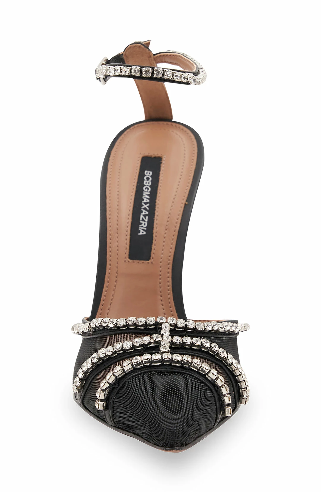Striking evening pump crafted from sheer mesh and smooth leather. Made with a pointed toe and embellished with sparkling rhinestones. Topped with a buckle ankle strap and finished with a stiletto heel.