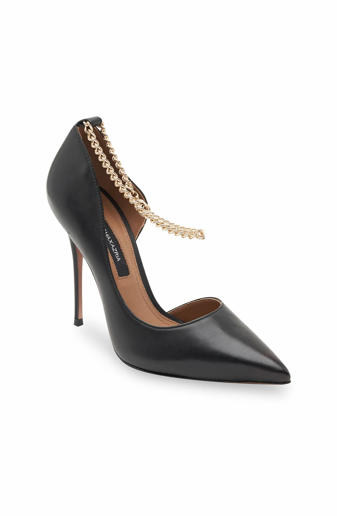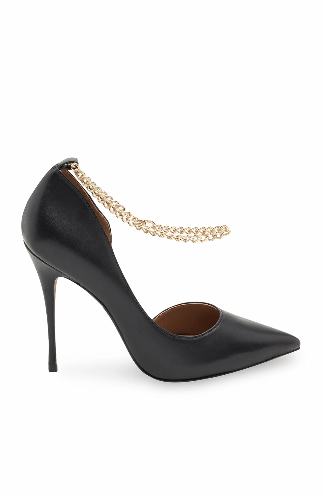 Showstopping pump crafted from embossed leather. Cut in a D’Orsay silhouette. Topped with an edgy ankle chain and complete with a sleek stiletto heel.