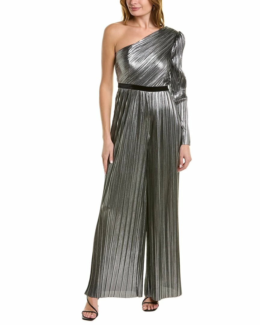 - One-Sleeve Jumpsuit In Silver With Belted Waist And Accordion Pleat Design