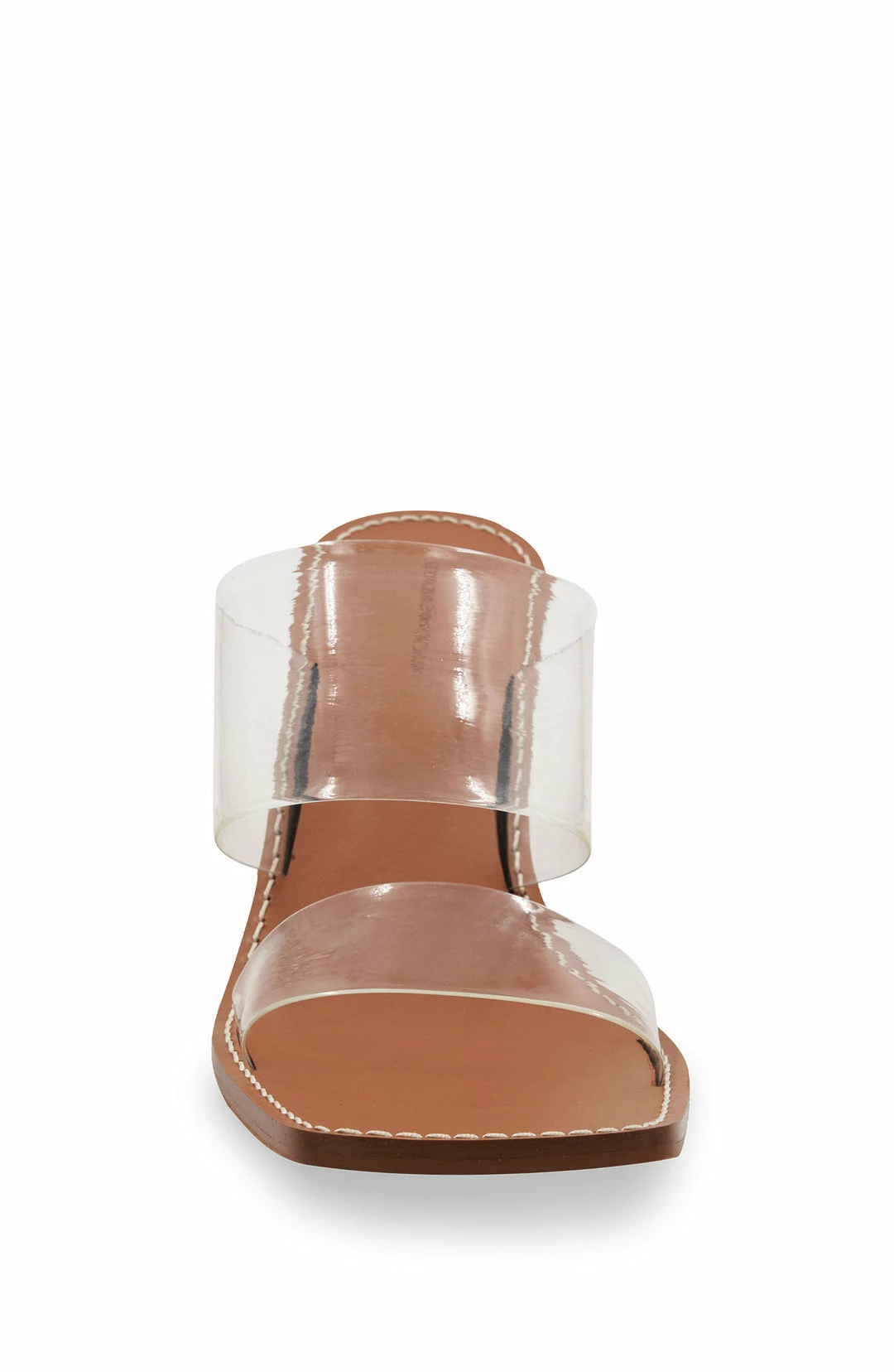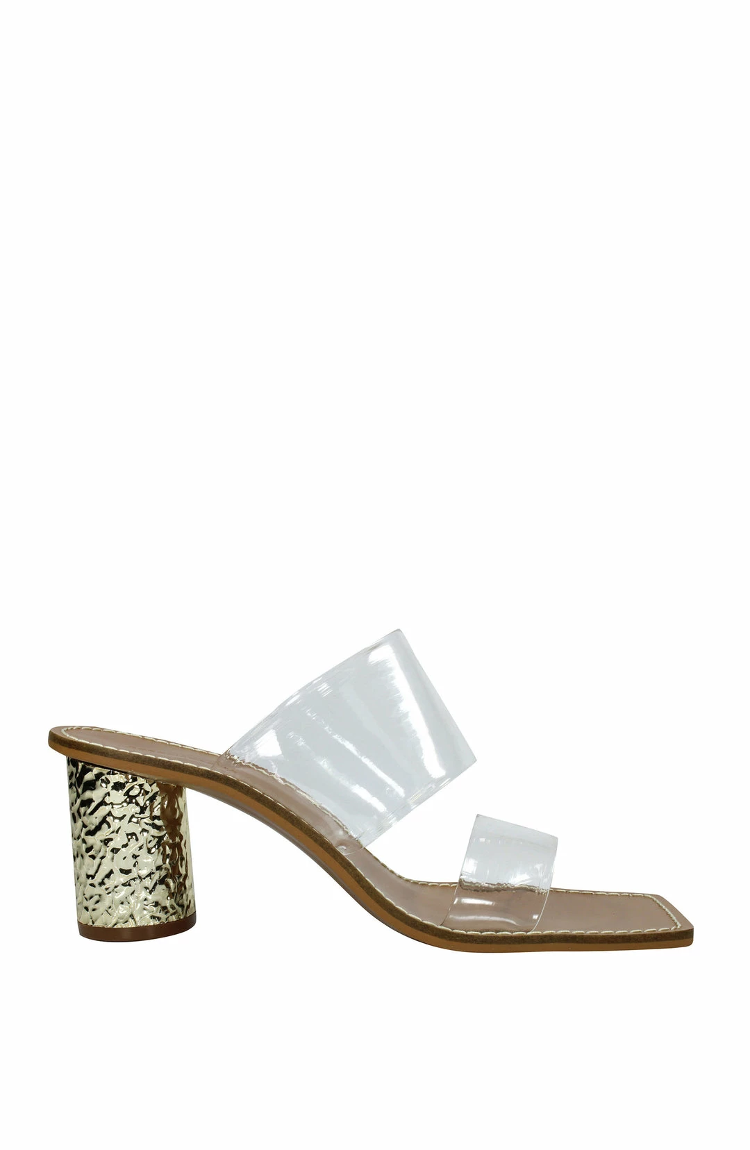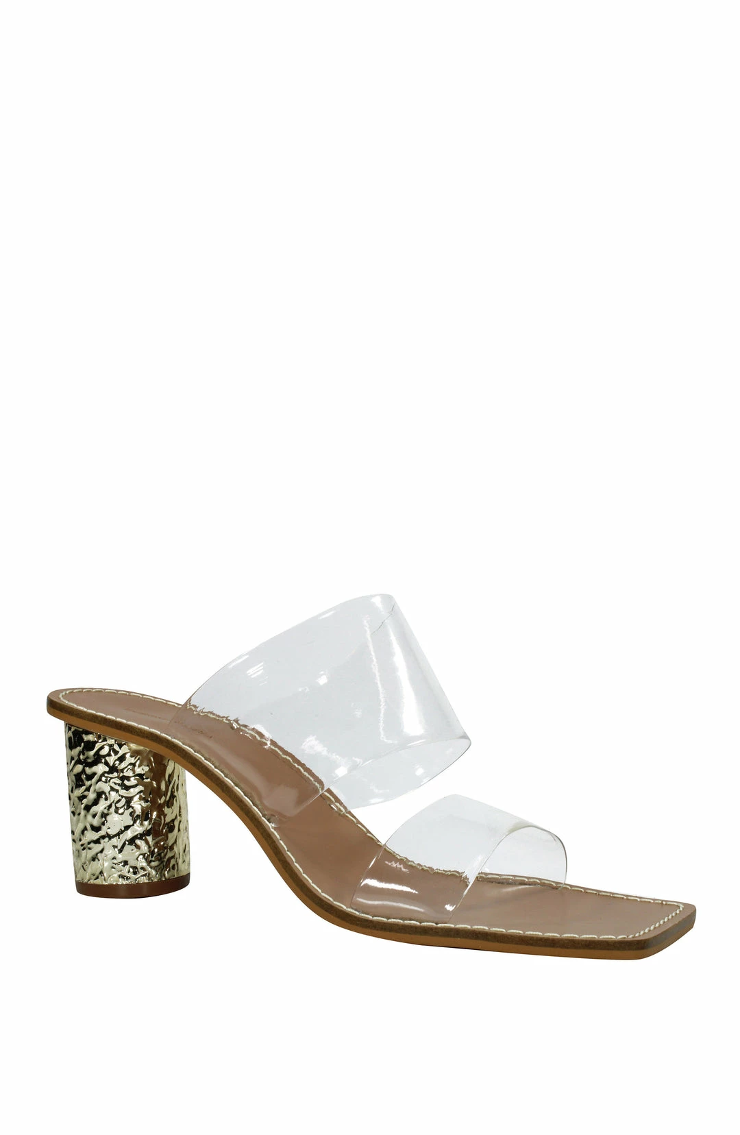 Minimal in the front and bold in the back. A modern square toe slip-on sandal crafted with double clear straps for a nude skin look that elongates. Finished with a textured round block heel for a striking accent.