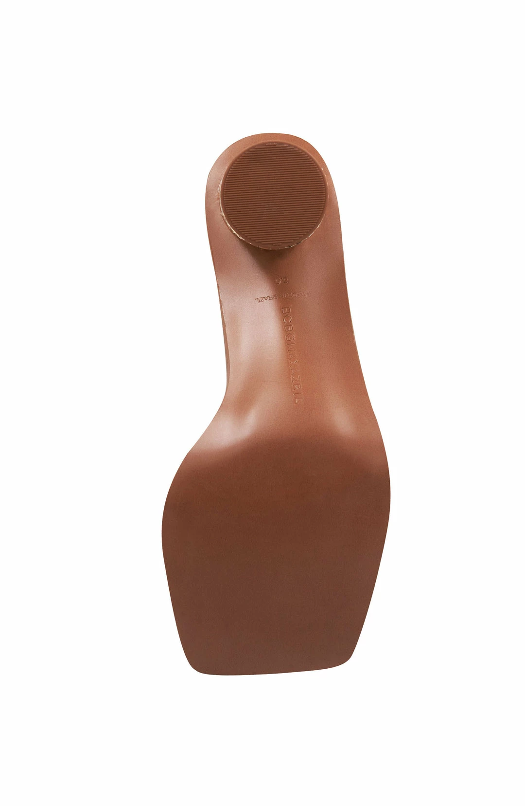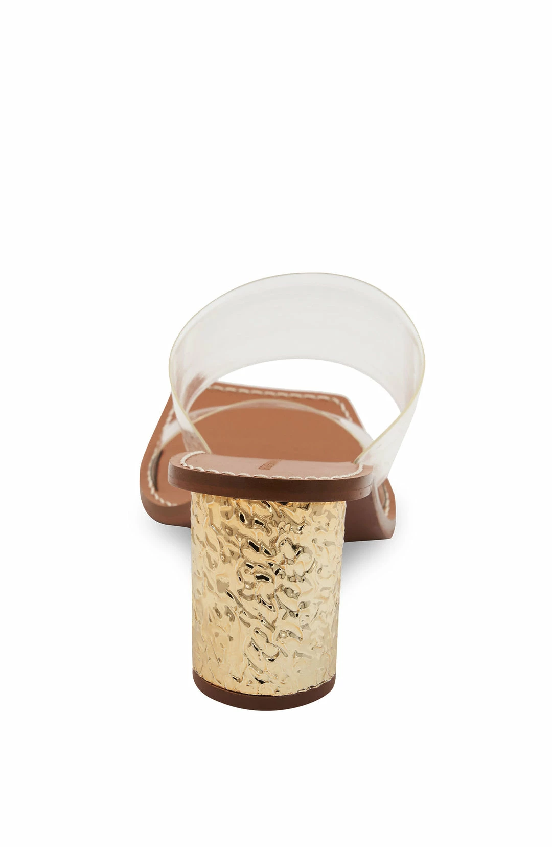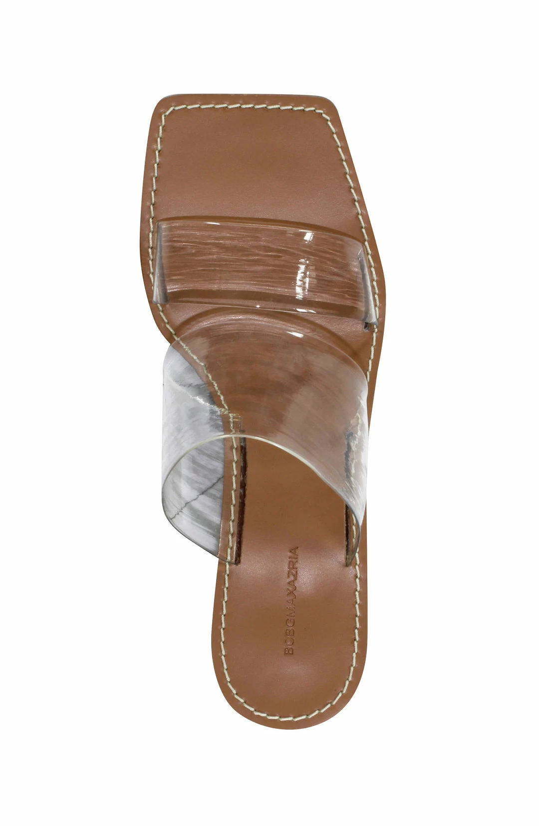 Minimal in the front and bold in the back. A modern square toe slip-on sandal crafted with double clear straps for a nude skin look that elongates. Finished with a textured round block heel for a striking accent.