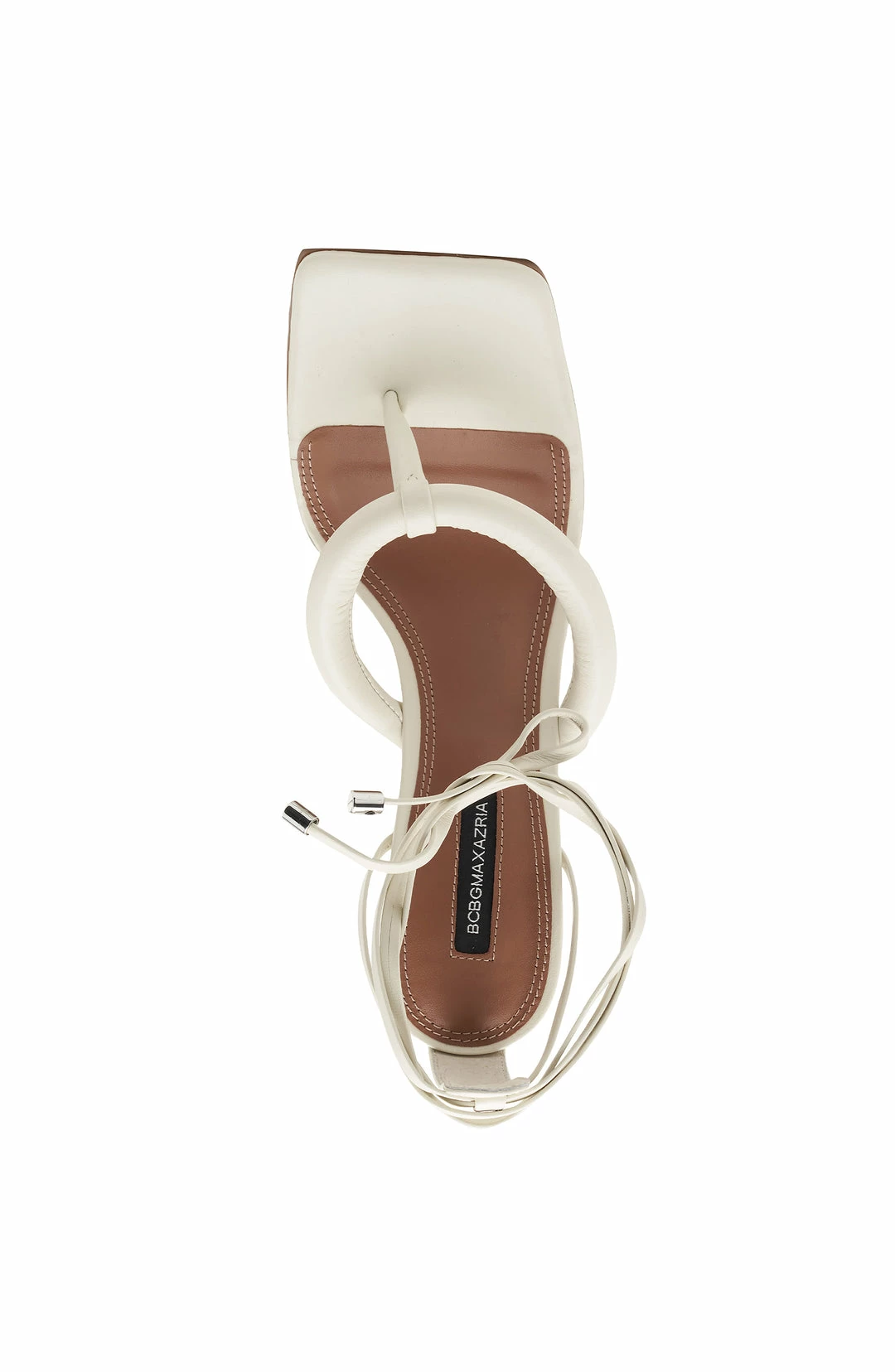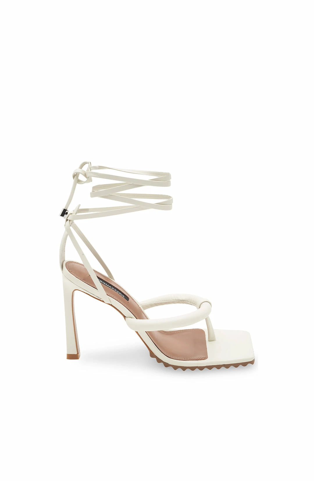 Striking thong sandal with a modern open square toe. Topped with self-tie multi-wrap ankle straps for a showstopping look. Finished with a sturdy stiletto heel.