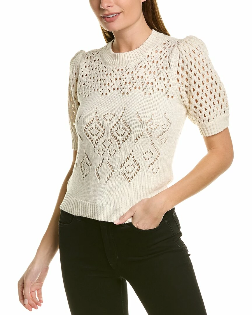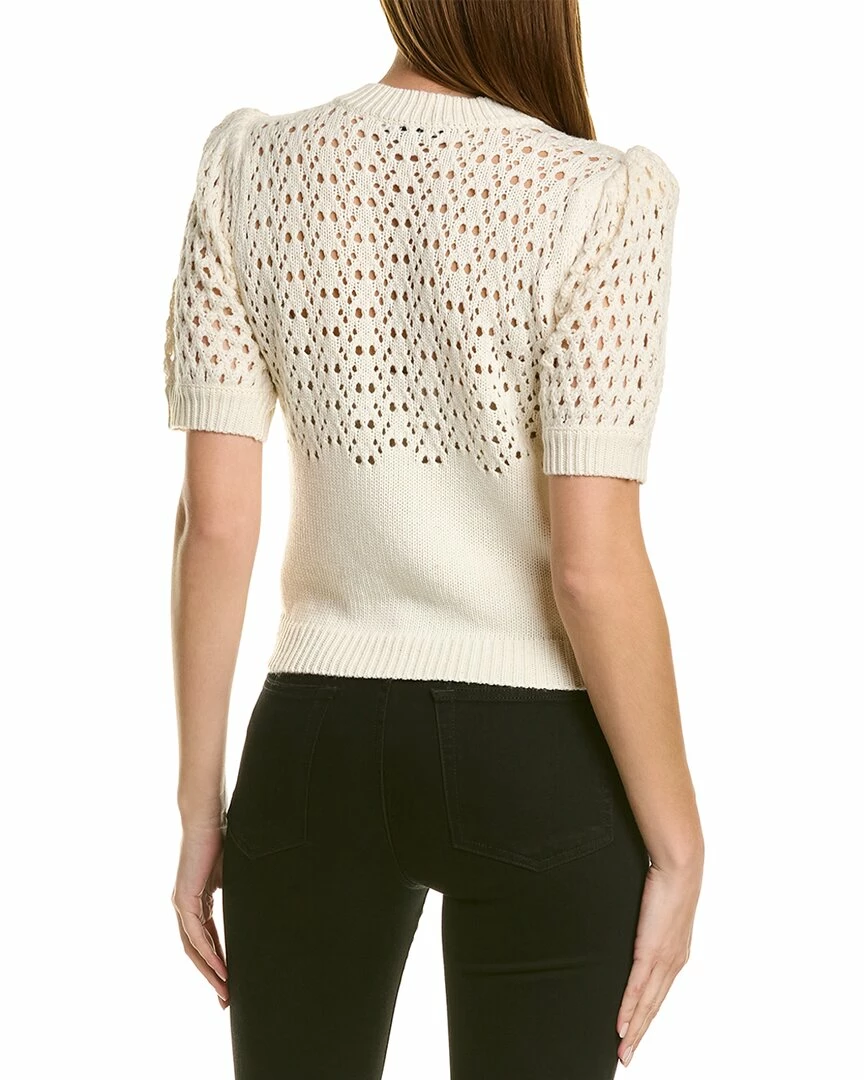 - Puff Sleeve Wool-Blend Sweater In Gardenia With Mixed Knit Stitch