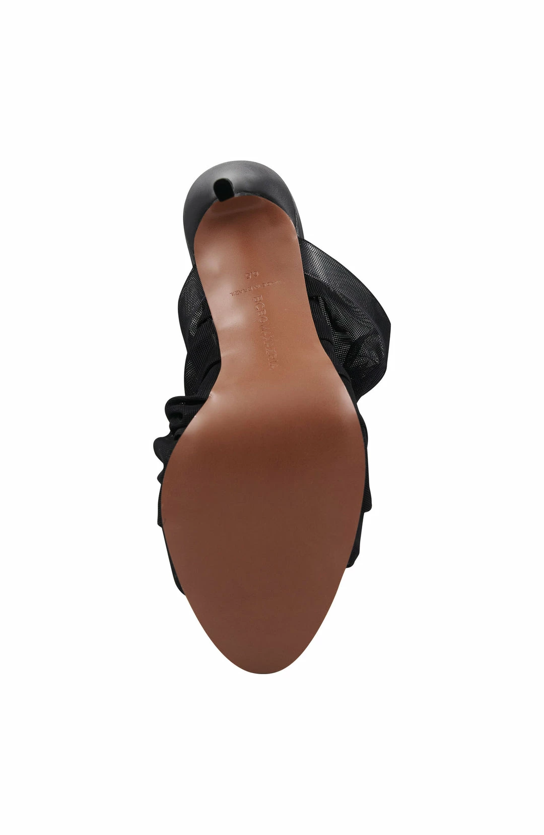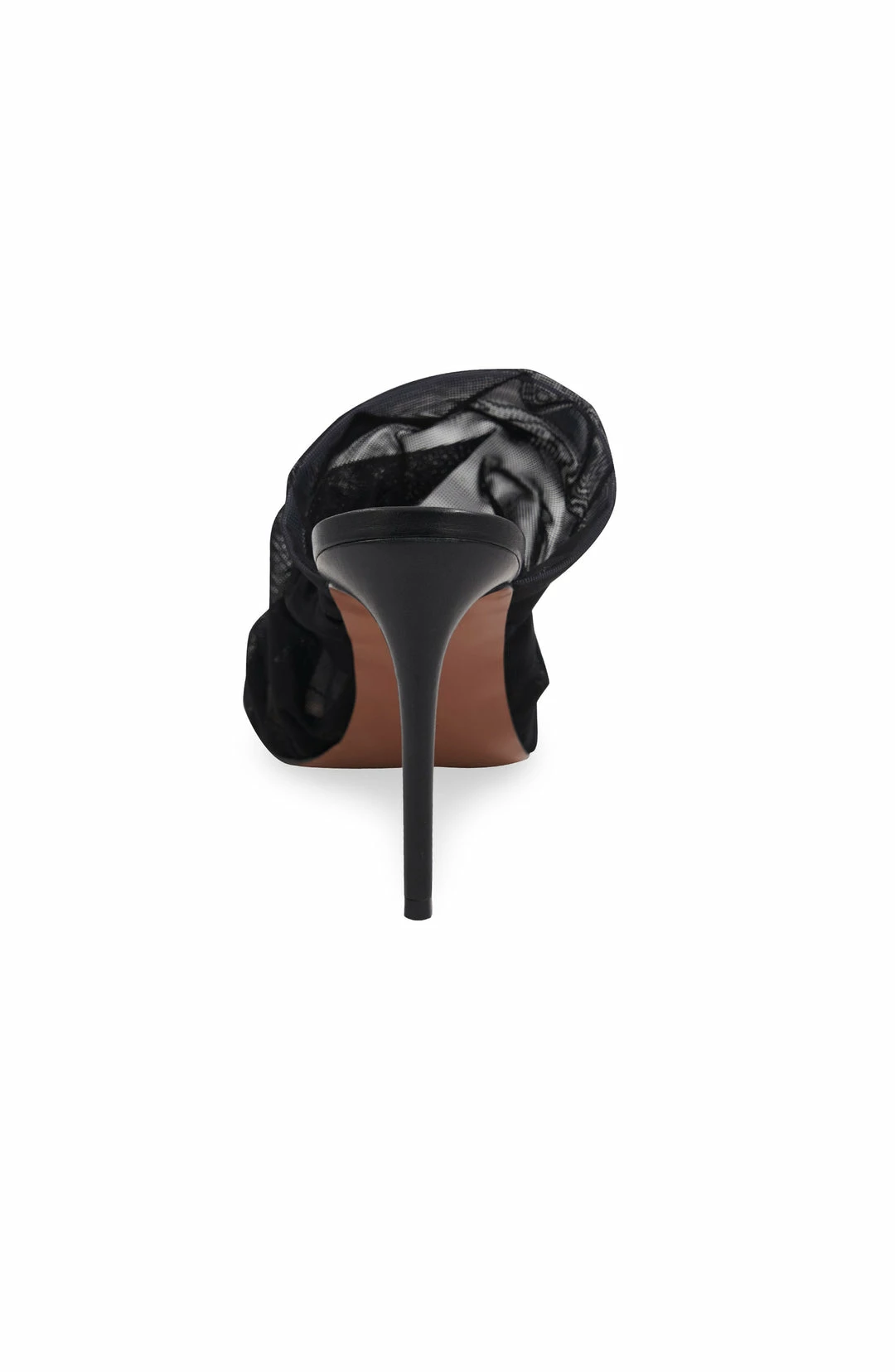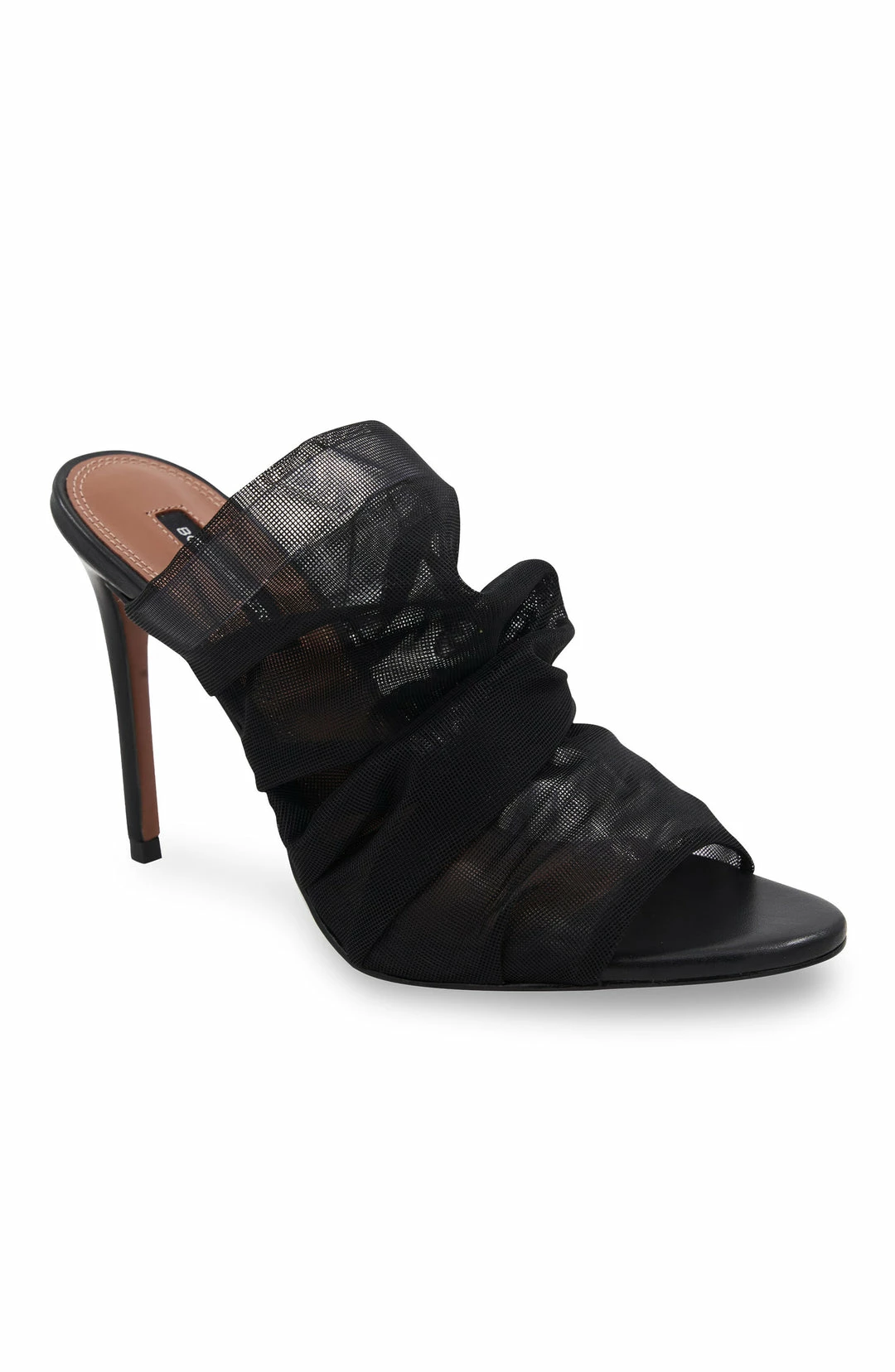 Sarani’ mules feature pleated mesh uppers set on slender 114mm stiletto heels. Complement the neutral shade with a tonal pedicure.