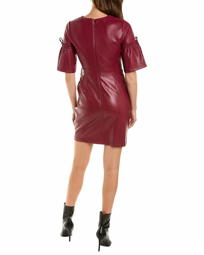 - Sheath Dress In Wine With Faux Leather Design, Drawstring Bell-Sleeves, And Side Seam Pockets