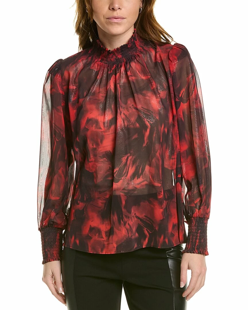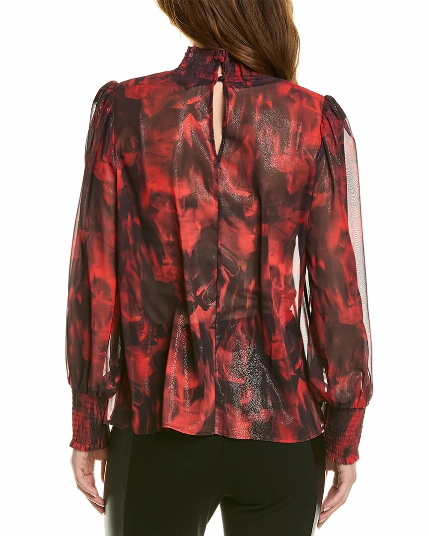 - Sheer Top In Red With Smocked Mock Neck And Cuffs