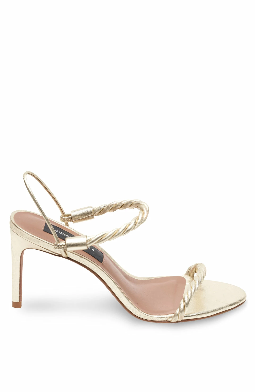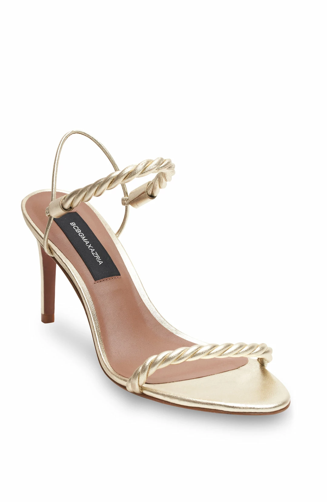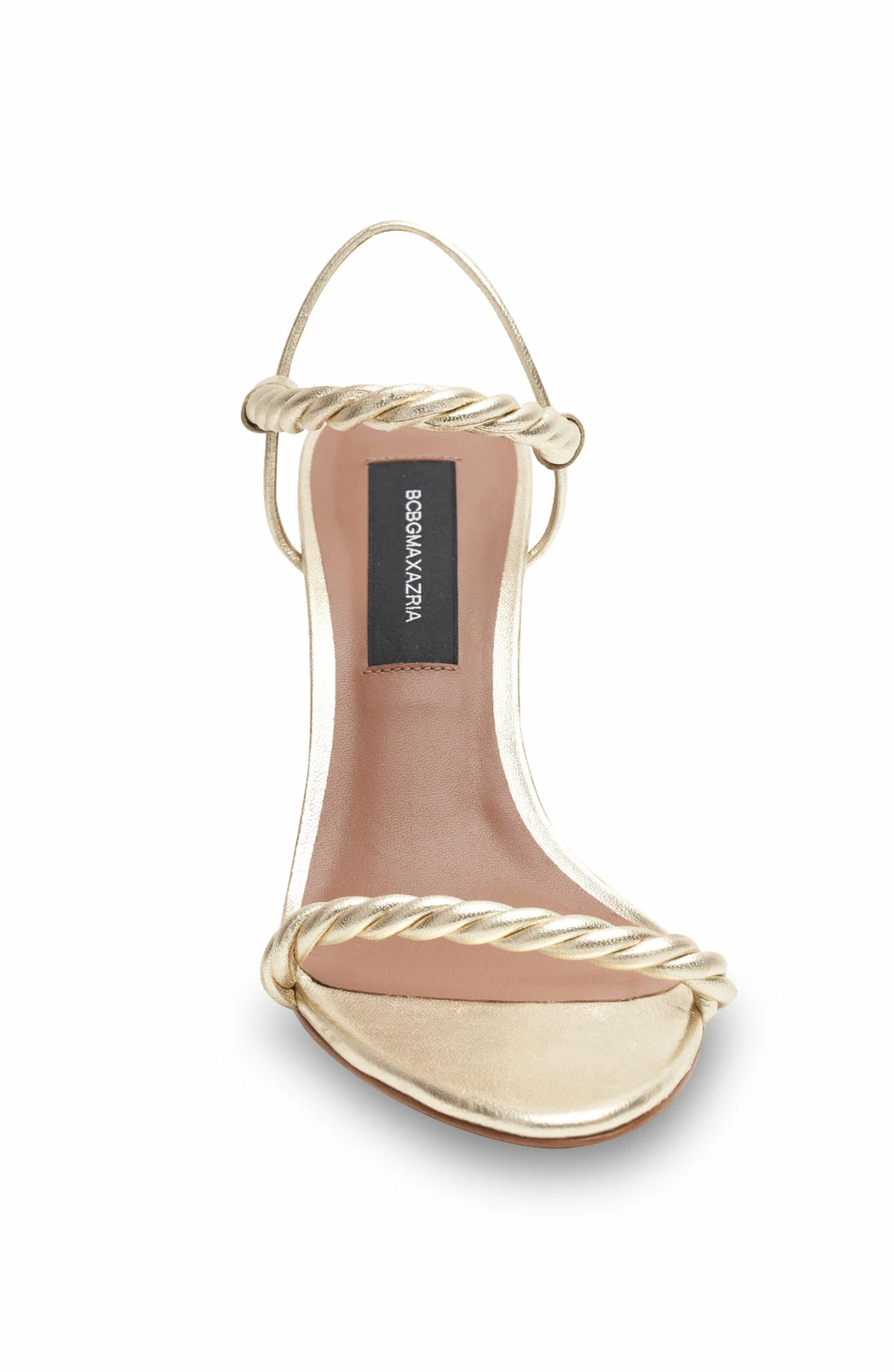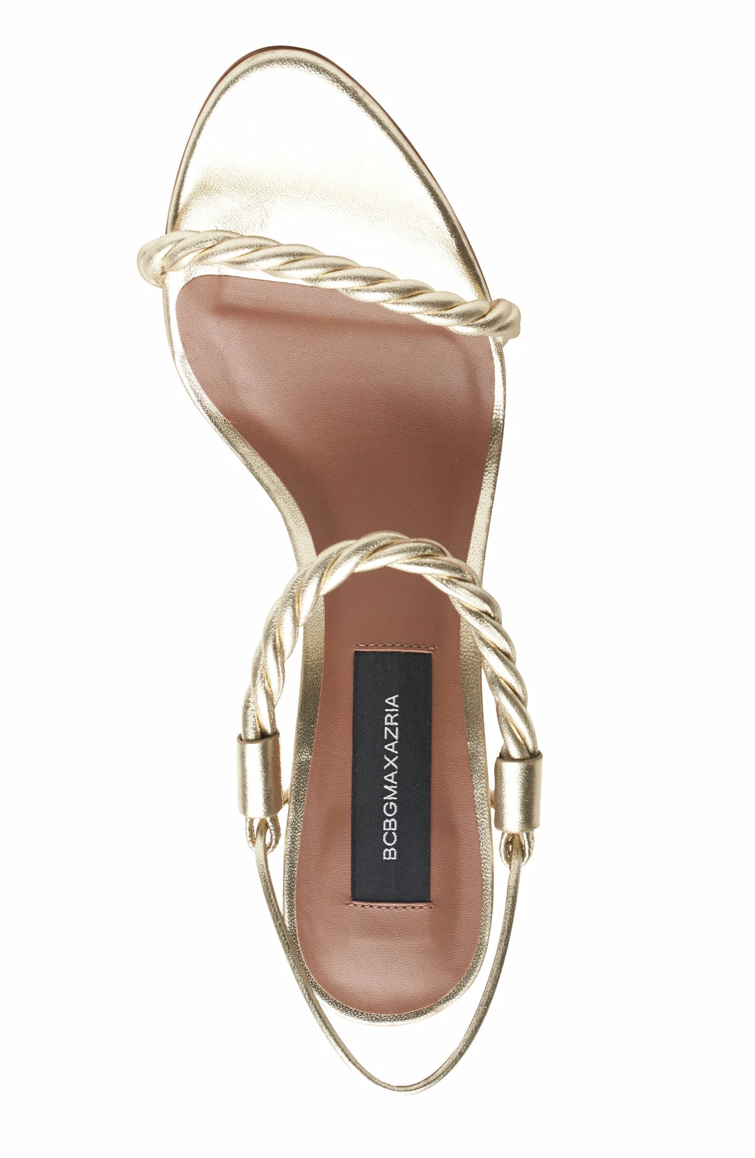 Chic, eye-catching sandal with a stiletto heel and bare silhouette. Topped with twisted straps for extra drama. Crafted with leather upper and insole and finished with a flexible outsole.