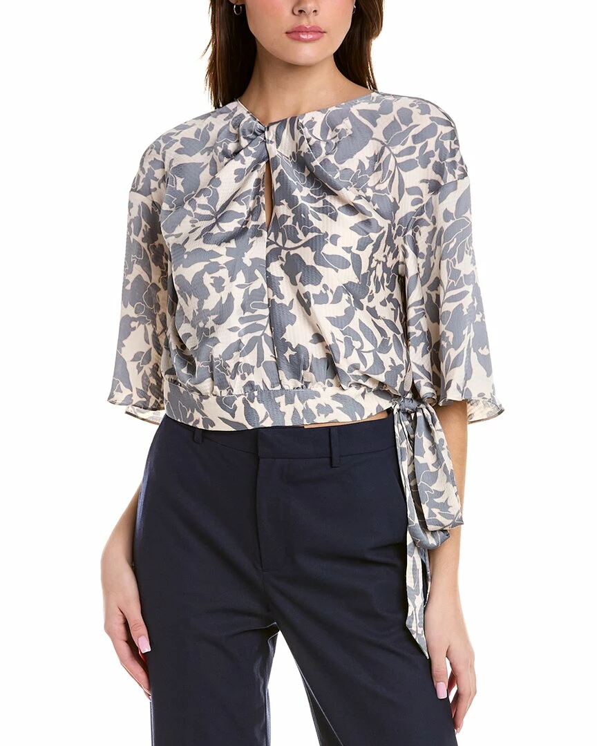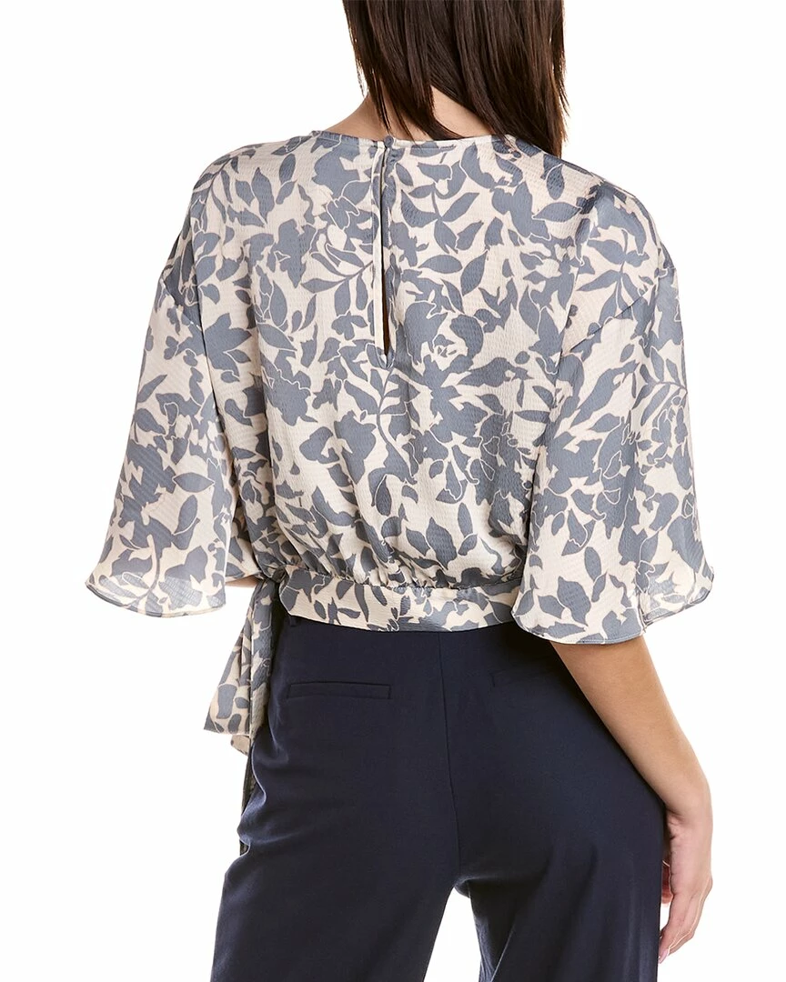 - Twisted Neck Blouse In Blush And Grey With Flare Sleeves And Left Side Tie Hem