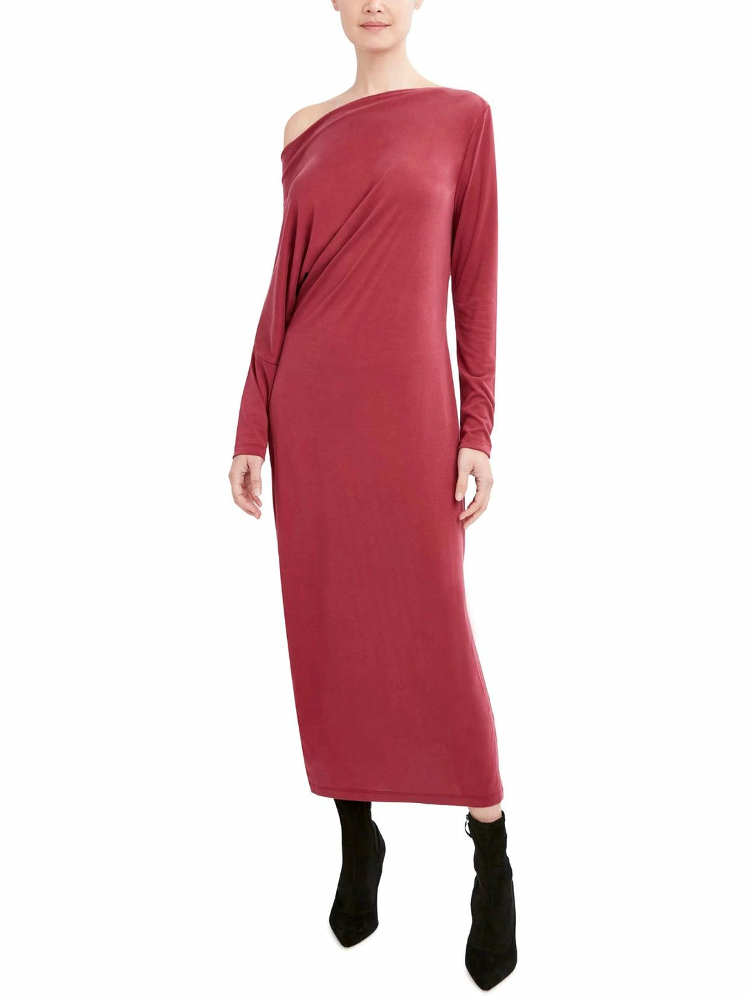 Step out in style no matter the occasion in this slouchy off the shoulder midi dress by BCBG Max Azria. Made with 65% Modal and 35% Polyester. This dress is made with a slouchy one shoulder design on ultra comfortable modal blend fabric. It features a side slit and a pull on closure. This dress is guaranteed authentic.