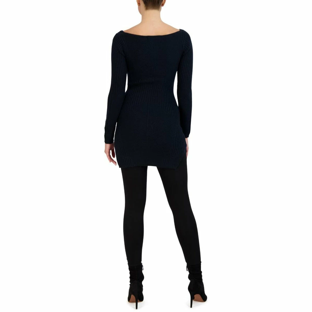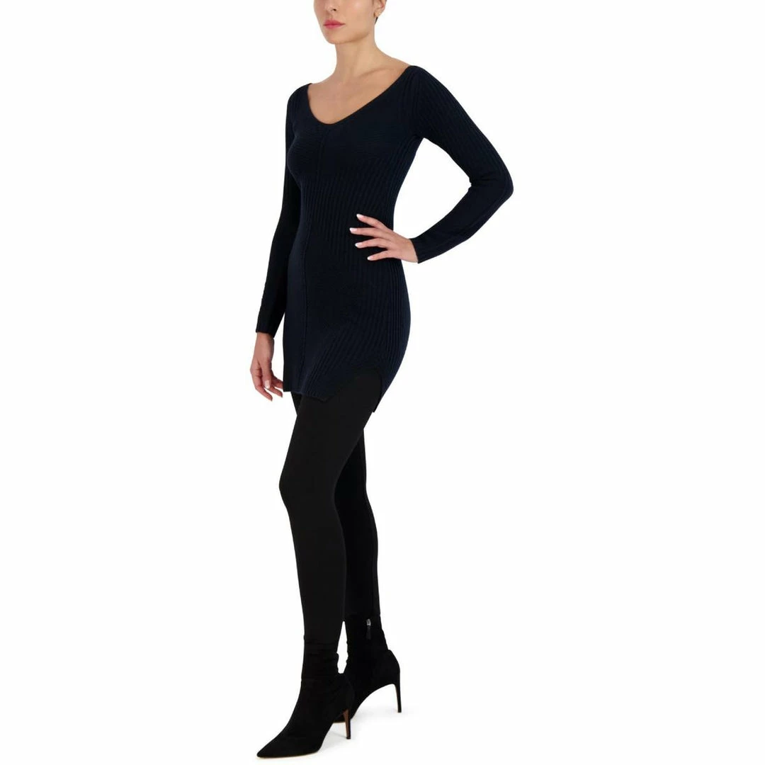 Cozy is coupled with style in this ribbed knit mini sweaterdress by BCBG Max Azria. This dress flaunts a fitted design, soft V-Neck, and long sleeves with seamed detailing.