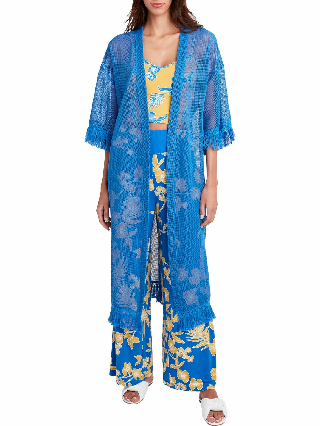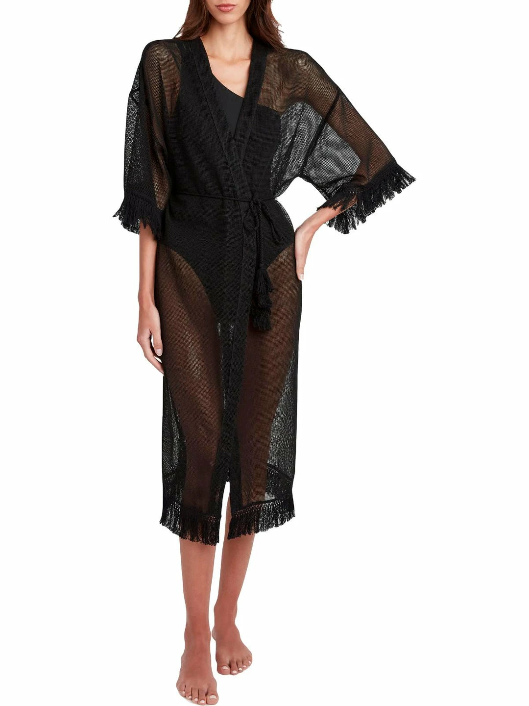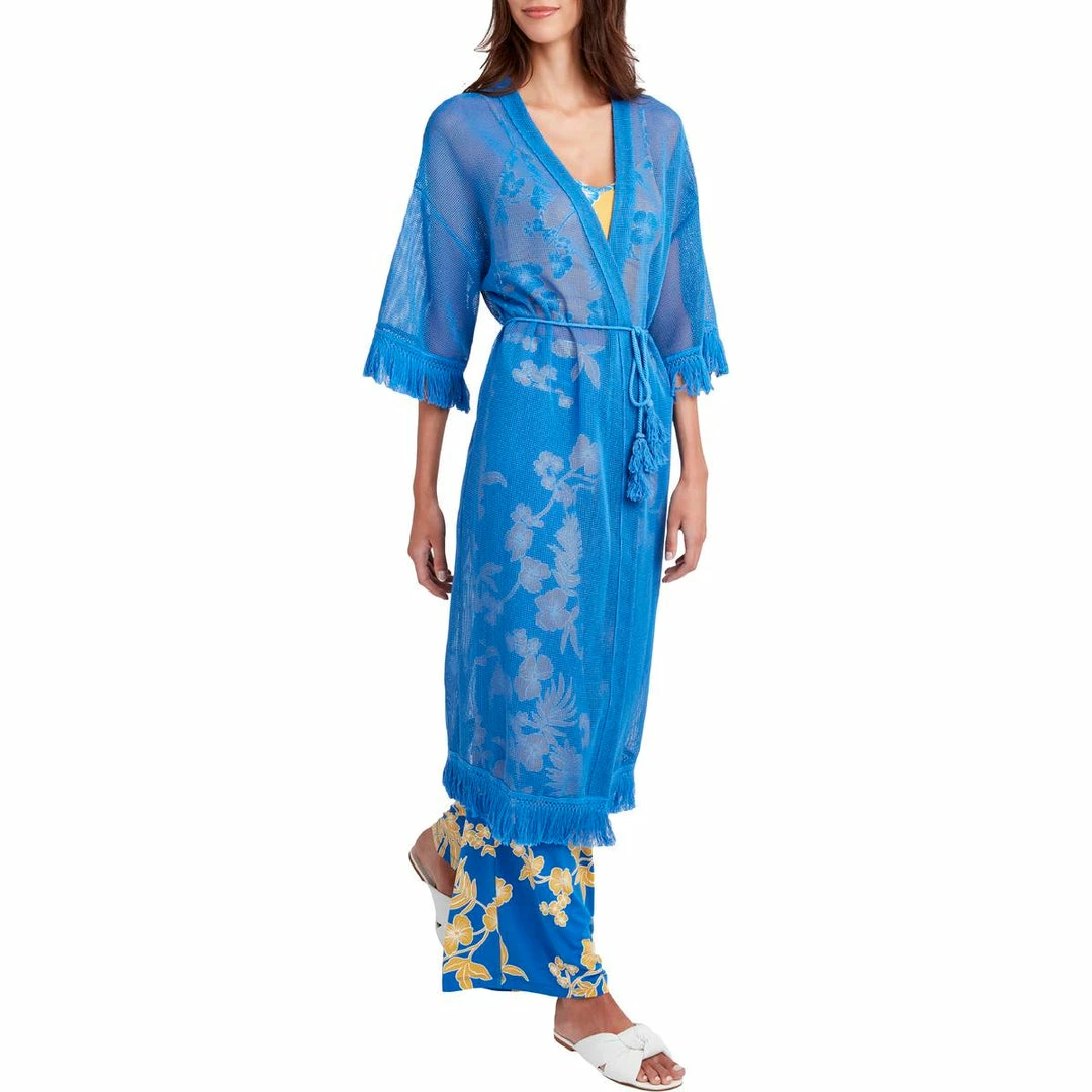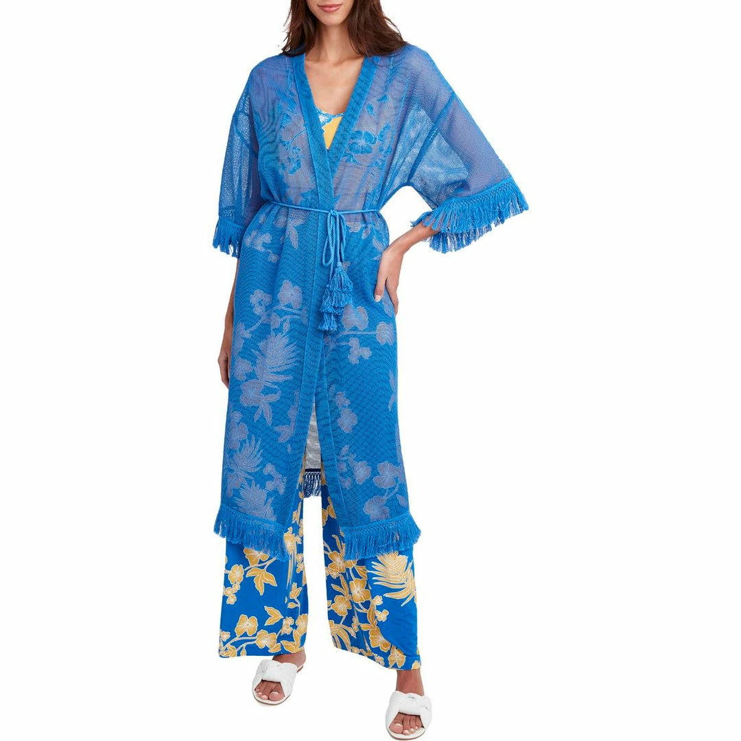 This mesh fringed cardigan by BCBG Max Azria offers chic style and lightweight coverage. Made with 75% polyester and 25% cotton. This cardigan features sheer mesh fabric, tasseled fringe details, and an open front construction. It’s versatile design will make it perfect for day to night wear. Elbow length sleeves. Pair it with all of your favorite casual ensembles. Long, duster style. No closure. This cardigan is guaranteed authentic.