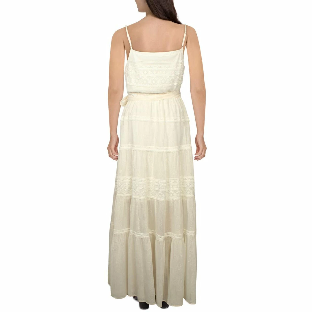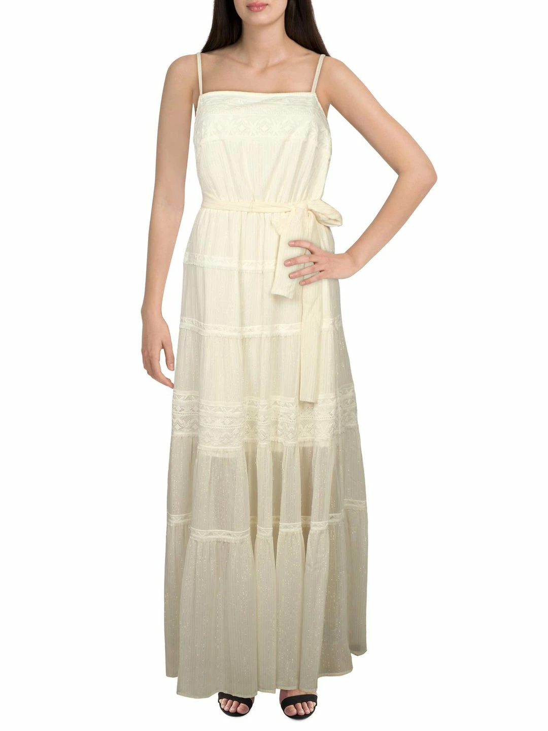 Radiate elegance in this metallic lace trim maxi gown by BCBG Max Azria. Crafted with a blend of 98% polyester and 2% spandex. This dressโs metallic shimmer coupled with the delicate lace trimming offer a look that is graceful and feminine. It features a belted waist and adjustable straps for an easy, comfortable fit. Pair it with your favorite heels for that upcoming special occasion. Square neck. Pullover. This dress is guaranteed authentic.