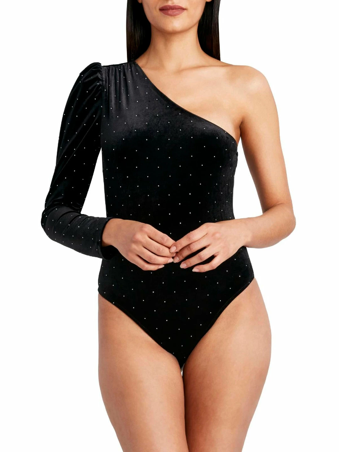 Add a little shimmer to your look with this embellished one shoulder bodysuit by BCBG Max Azria. Made with 90% Polyester and 10% Spandex. This bodysuit features sparkling rhinestone embellishments and an elegant one shoulder design. Bodysuit also has thong style cut and a pull on closure. This jumpsuit is guaranteed authentic.