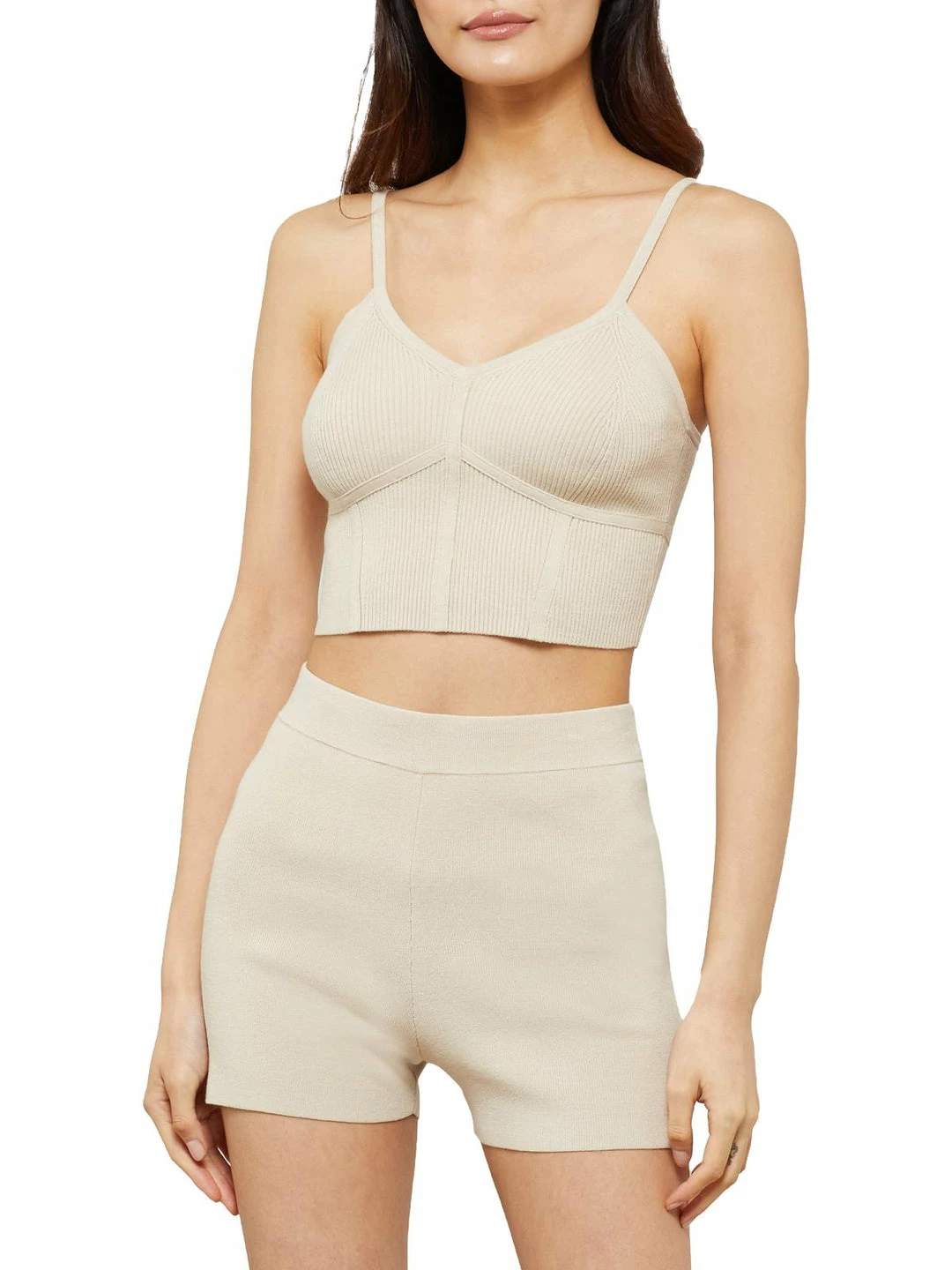 Show off your sun kissed skin in this ribbed knit bralette crop top by BCBG Max Azria. Made with 60% viscose, 23% polyester, and 17% nylon. This top is crafted with stretchy ribbed knit fabric and sexy seamed details. It features a V-Neck construction and spaghetti straps. It’s versatile design can be worn as is for a night out or layered up for a more sophisticated look. Pull on. This top is guaranteed authentic.
