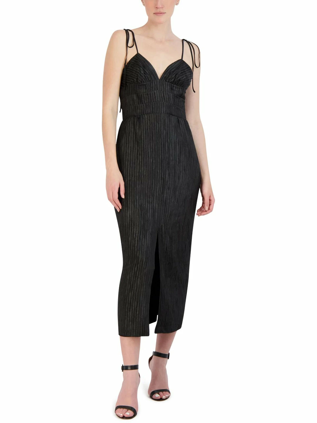 This pleated satin sleeveless gown by BCBGMAXAZRIA offers glamorous, show stopping style. Made with Polyester and Spandex. It features a pleated satin and column style construction that will have you red carpet ready. Style includes a plunging neckline with tie straps and a zipper closure.